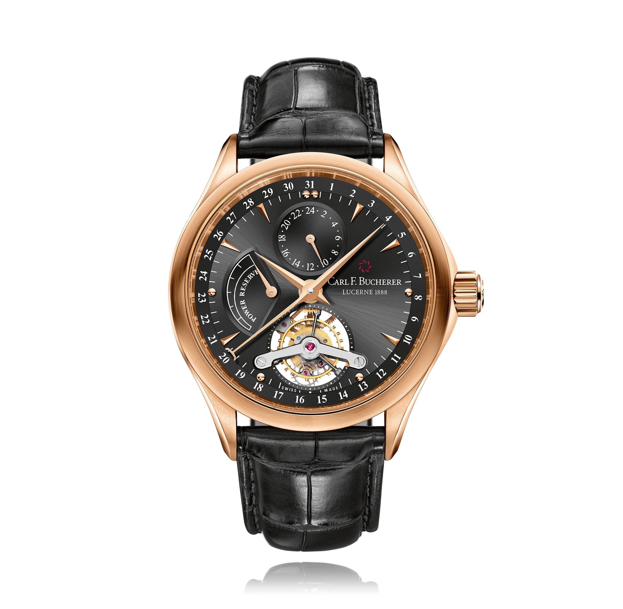 Carl F. Bucherer Manero avec un boîtier de 42 mm en or rose et un verre saphir, étanche; à l'intérieur se trouve le calibre manuel t1001, avec fonction supplémentaire tourbillon cadran noir index, indication: , bracelet alligator en cuir; accessoire: écrin (original).
