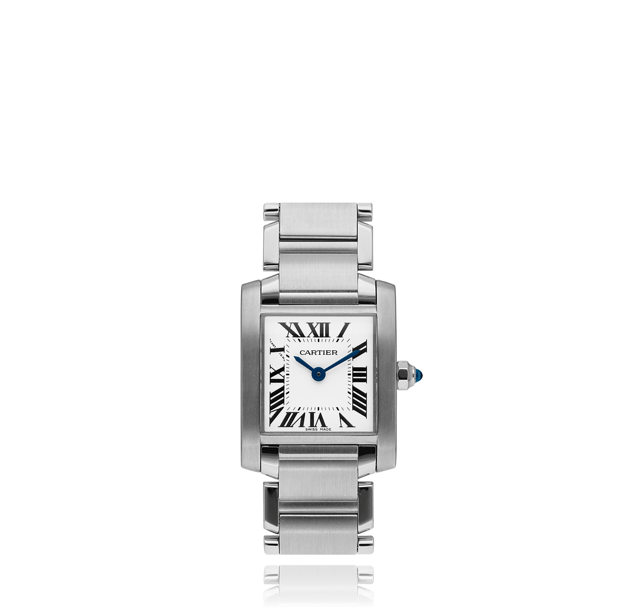Cartier Tank avec un boîtier de 20 mm en acier et un verre saphir, étanche; à l'intérieur se trouve le calibre quartz , cadran blanc romain, indication: sans date, bracelet acier métal; accessoire: écrin (original).