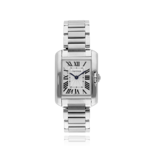 Cartier Tank avec un boîtier de 23 mm en acier et un verre saphir, étanche; à l'intérieur se trouve le calibre quartz , cadran argent romain, indication: sans date, bracelet acier métal; accessoire: écrin de la marque.