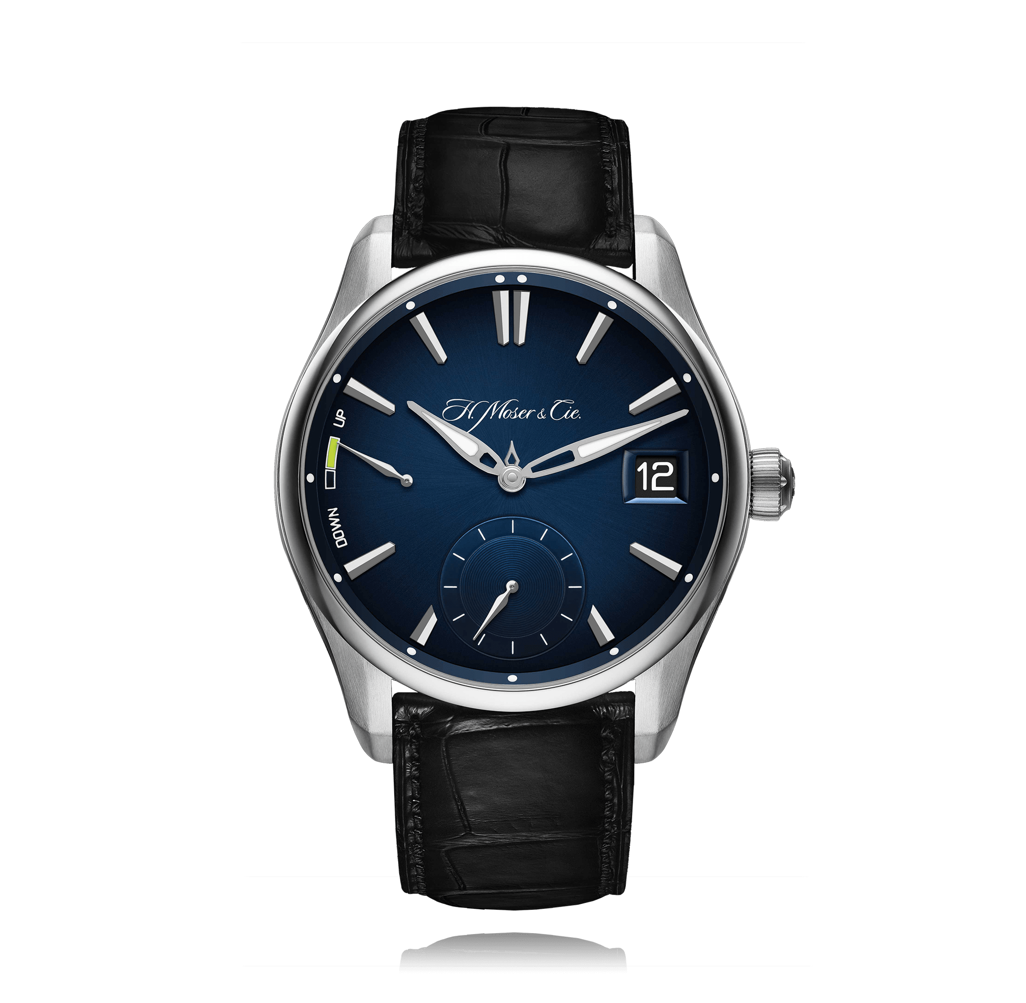 Montre-bracelet H. MOSER Pioneer 42.8mm, acier cuir alligator, avec boucle ardillon, avec index, remontage manuel Calibre HMC 800, glace saphir, avec calendrier perpétuel, Ref.:3800-1200
