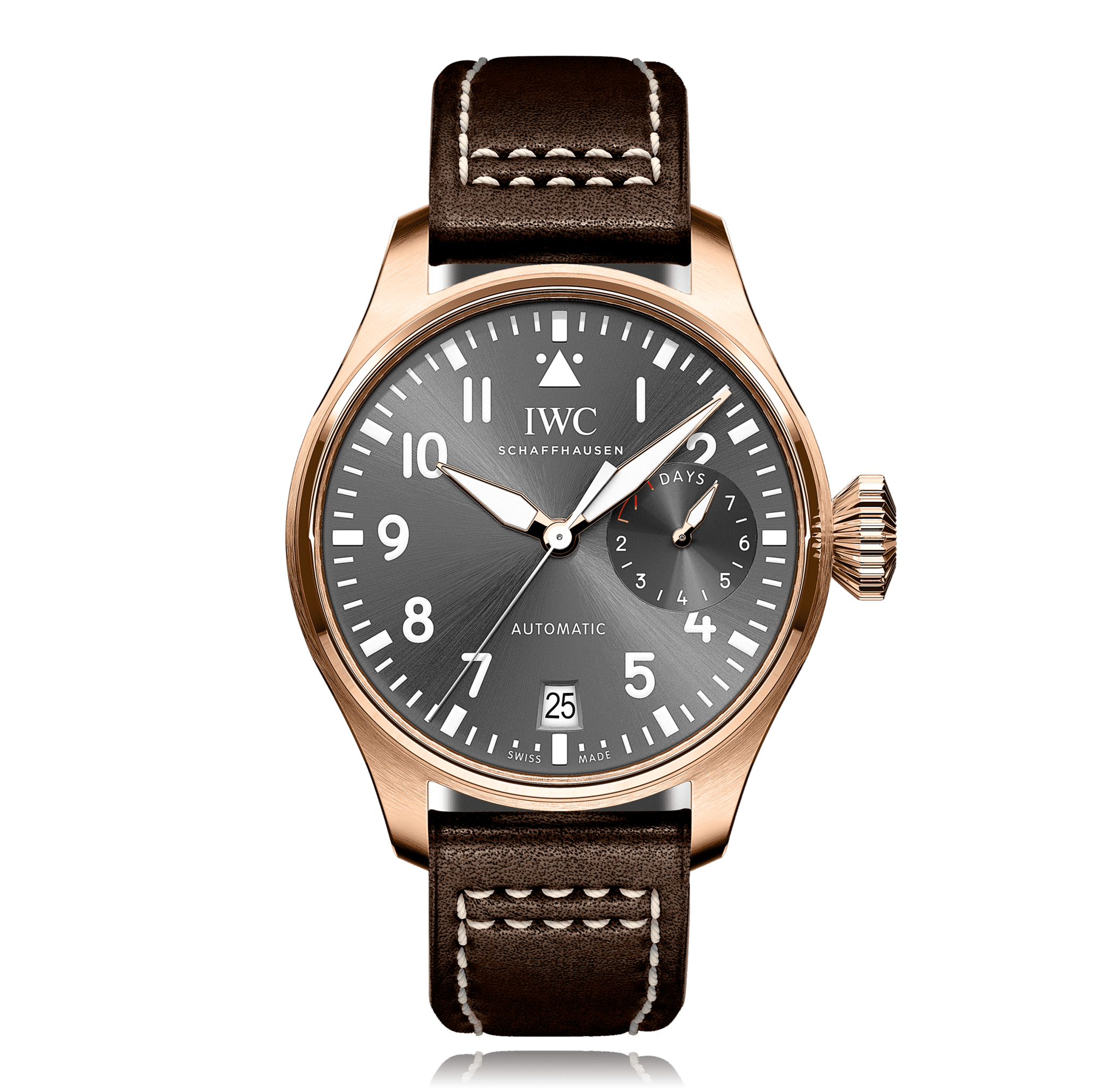 IWC Schaffhausen Big Pilot avec un boîtier de 46 mm en or rose et un verre saphir, étanche; à l'intérieur se trouve le calibre automatique 51111, avec fonction supplémentaire reserve de marche cadran gris arabe, indication: avec date, bracelet veau en cuir; accessoire: écrin (original), garantie de vente (original).