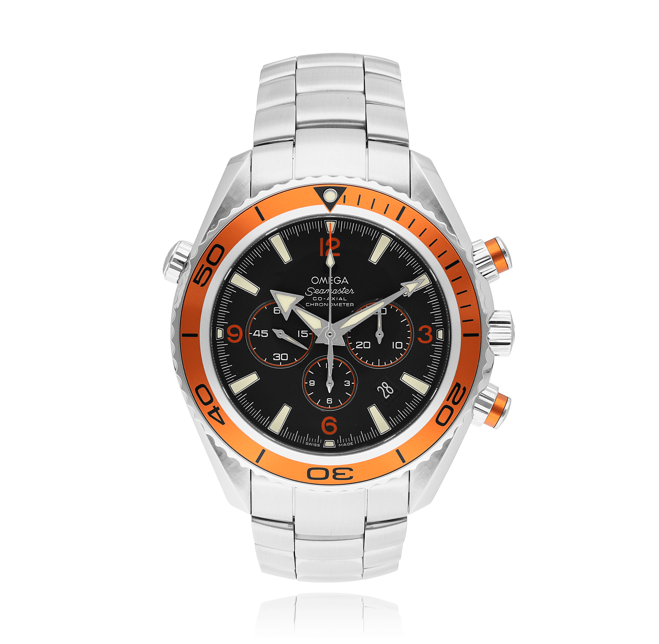Omega Seamaster, avec un boîtier de 46 mm en acier et un verre saphir, étanche; à l'intérieur se trouve le calibre automatique 3313, avec fonction supplémentaire chronographe cadran noir index, indication: avec date, bracelet acier métal; accessoire: écrin de bucherer