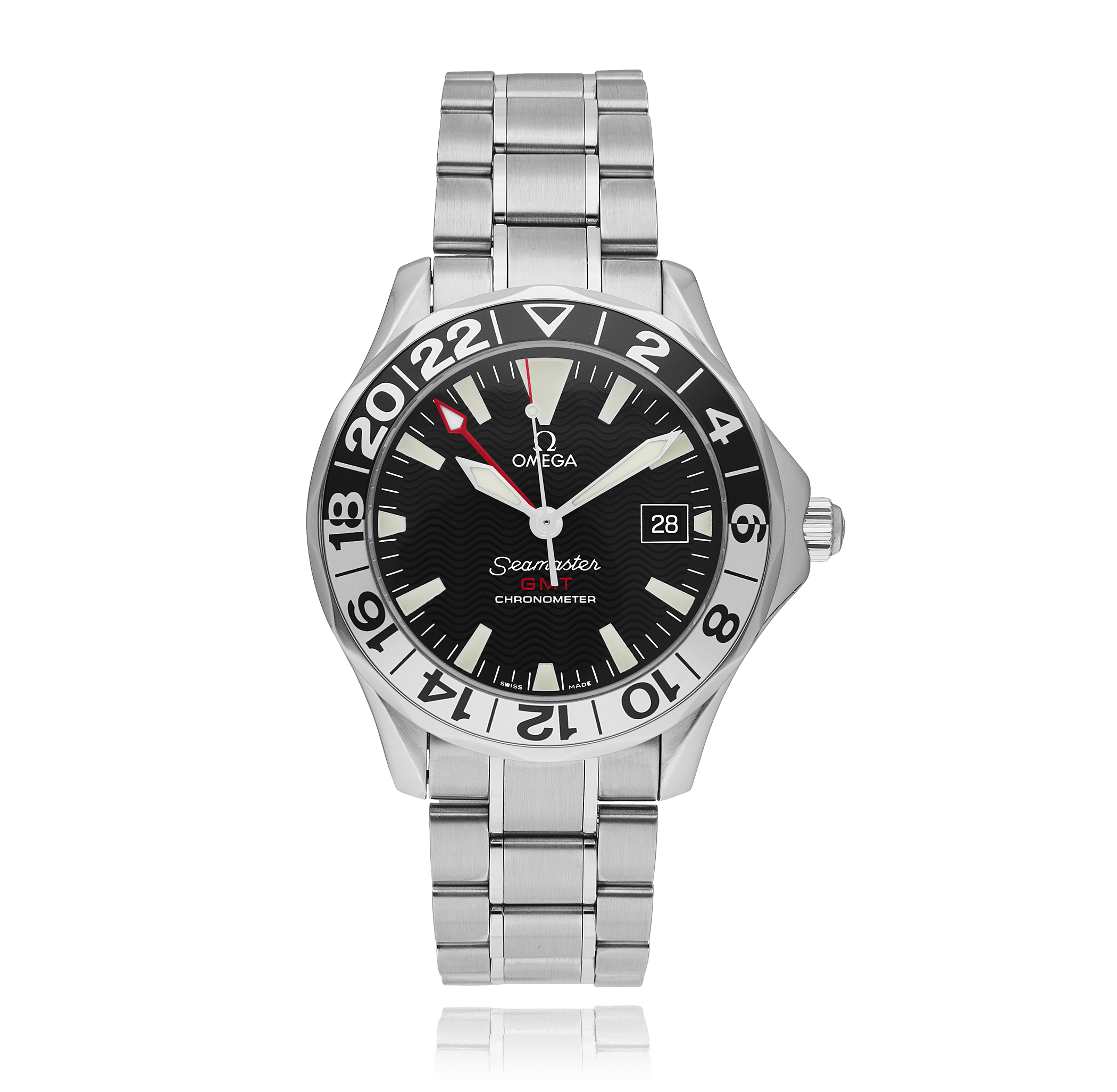 Omega Seamaster avec un boîtier de 41 mm en acier et un verre saphir, étanche; à l'intérieur se trouve le calibre automatique 1128, avec fonction supplémentaire deuxieme fuseau horaire cadran noir index, indication: avec date, bracelet acier métal; accessoire: garantie de vente (original), écrin (original).