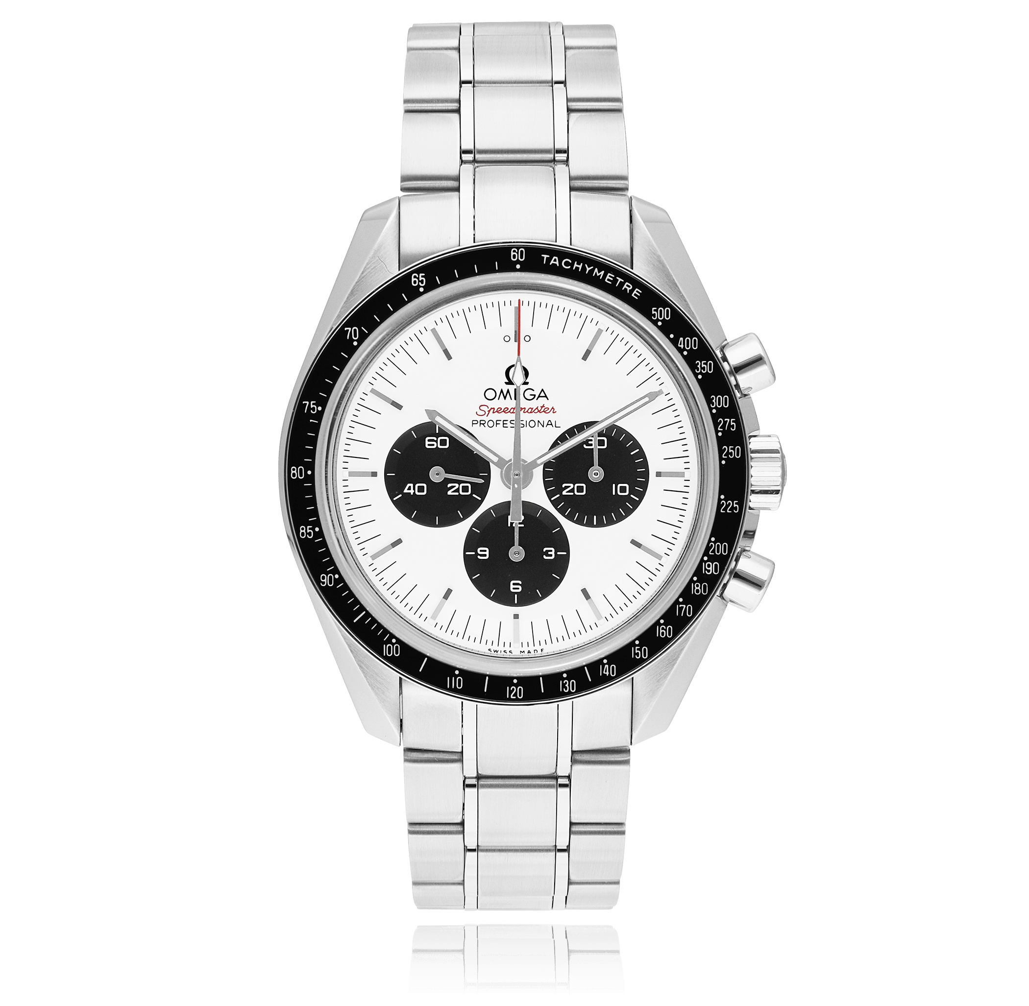 Omega Specialities avec un boîtier de 42 mm en acier et un verre saphir, étanche; à l'intérieur se trouve le calibre manuel 1861, avec fonction supplémentaire chronographe cadran argent index, indication: sans date, bracelet acier métal; accessoire: garantie de vente (original), écrin (original).
