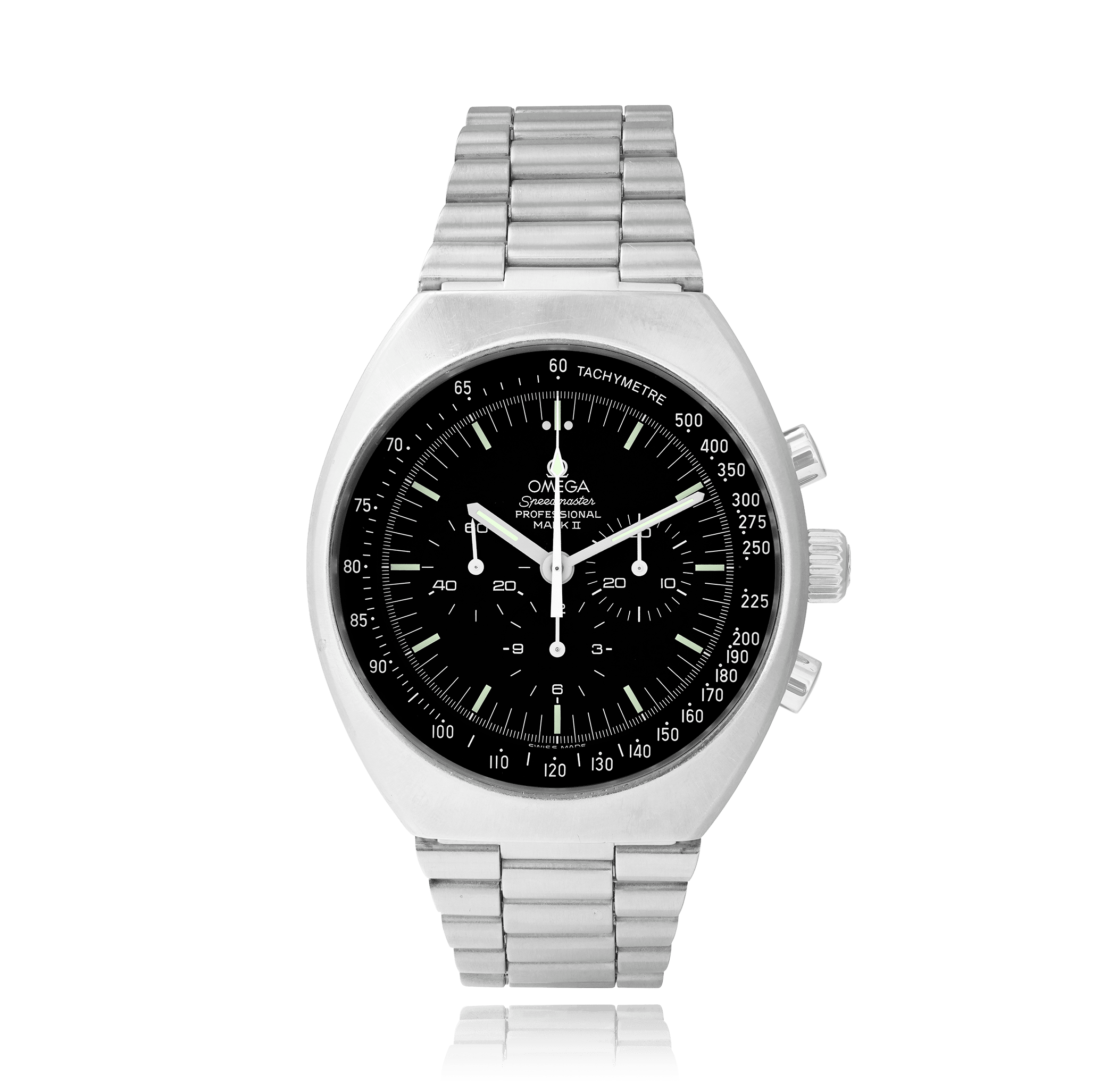 Omega Speedmaster avec un boîtier de 41 mm en acier et un verre saphir, pas étanche; à l'intérieur se trouve le calibre manuel 861, avec fonction supplémentaire chronographe cadran noir index, indication: sans date, bracelet acier métal; accessoire: écrin de bucherer.