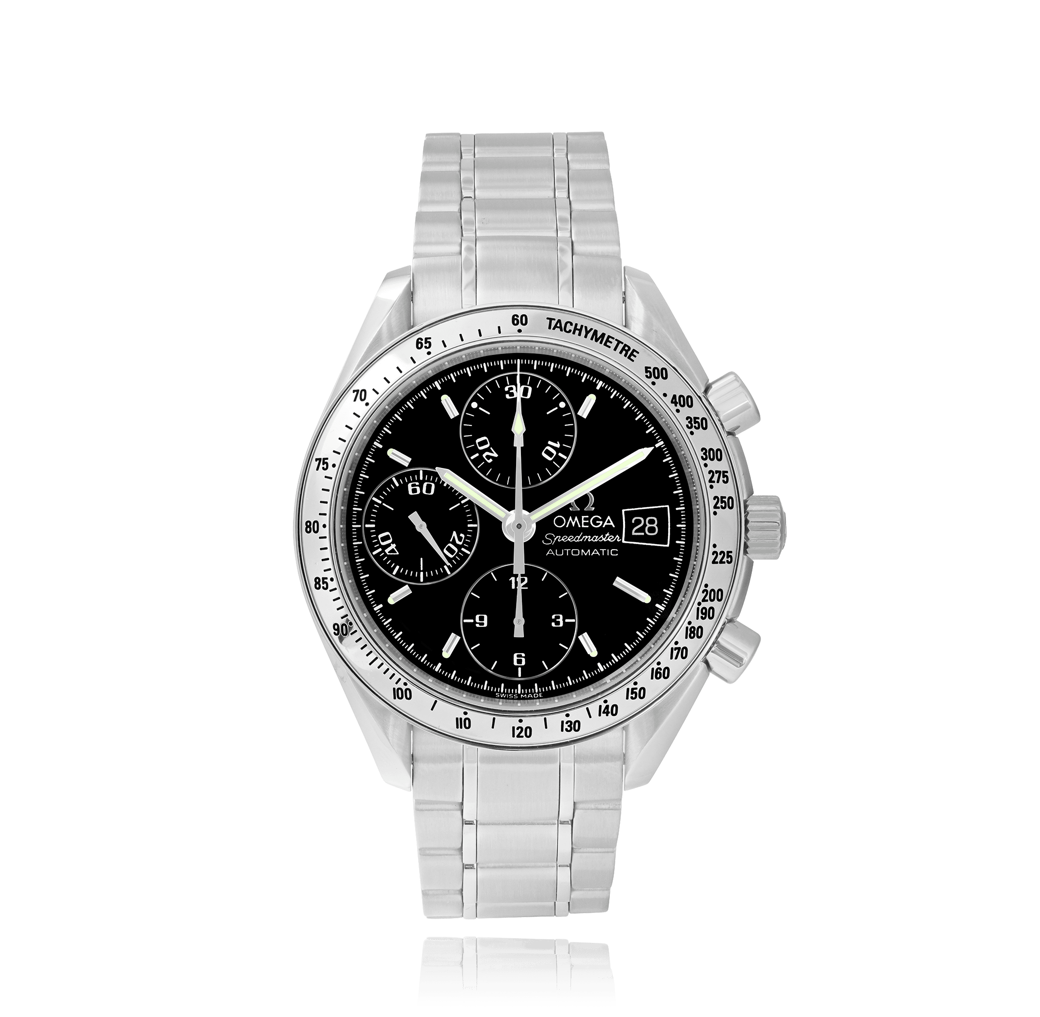 Omega Speedmaster avec un boîtier de 39 mm en acier et un verre , étanche; à l'intérieur se trouve le calibre automatique 1152, avec fonction supplémentaire chronographe cadran noir , indication: avec date, bracelet acier métal; accessoire: garantie de vente (original), écrin de bucherer.