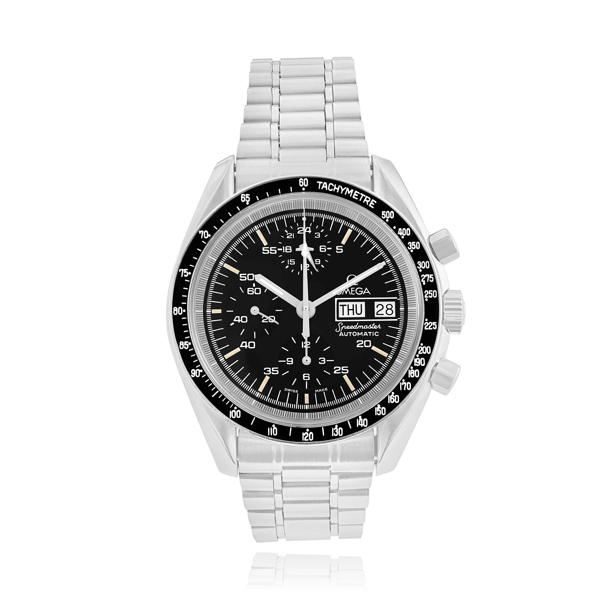 Omega Speedmaster avec un boîtier de 42 mm en acier et un verre acrilique, pas étanche; à l'intérieur se trouve le calibre automatique 1045, cadran noir index, indication: avec date, bracelet acier métal; accessoire: écrin de bucherer.