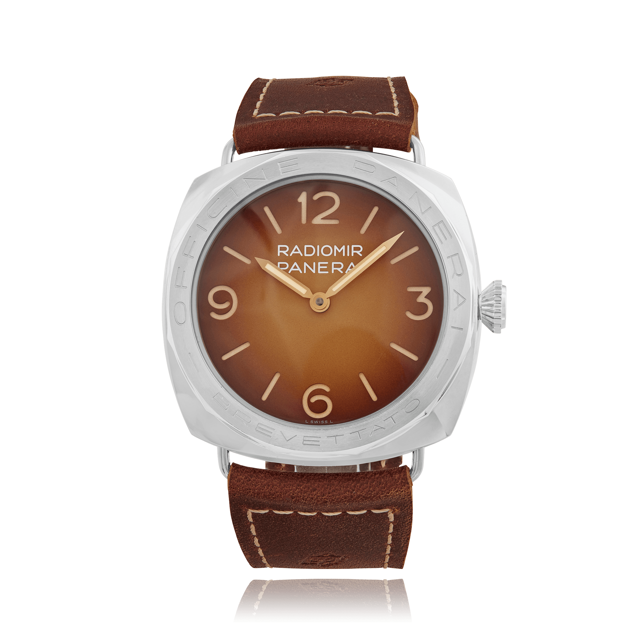 Panerai Radiomir Vintage avec un boîtier de 47 mm en acier et un verre acrilique, étanche; à l'intérieur se trouve le calibre manuel p.3000, cadran brun arabe / index, indication: sans date, bracelet veau en cuir; accessoire: écrin (original), garantie de vente (original).