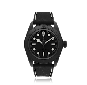 Tudor Black Bay avec un boîtier de 41 mm en ceramique et un verre saphir, étanche; à l'intérieur se trouve le calibre automatique mt5602-1u, cadran noir index, indication: sans date, bracelet suède en cuir; accessoire: garantie de vente (original), écrin (original).