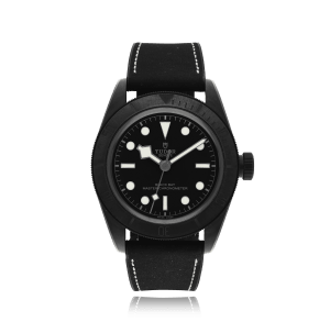Tudor Black Bay avec un boîtier de 41 mm en ceramique et un verre saphir, étanche; à l'intérieur se trouve le calibre automatique mt5602-1u, cadran noir index, indication: sans date, bracelet caoutchouc ; accessoire: garantie de vente (original), écrin (original).