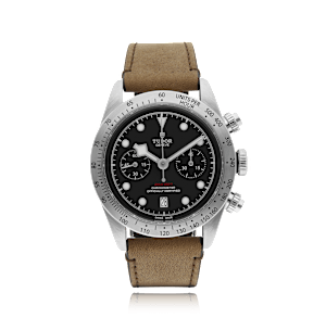 Tudor Black Bay avec un boîtier de 41 mm en acier et un verre saphir, étanche; à l'intérieur se trouve le calibre automatique mt5813, cadran noir index, indication: avec date, bracelet veau en cuir; accessoire: garantie de vente (original), écrin (original).