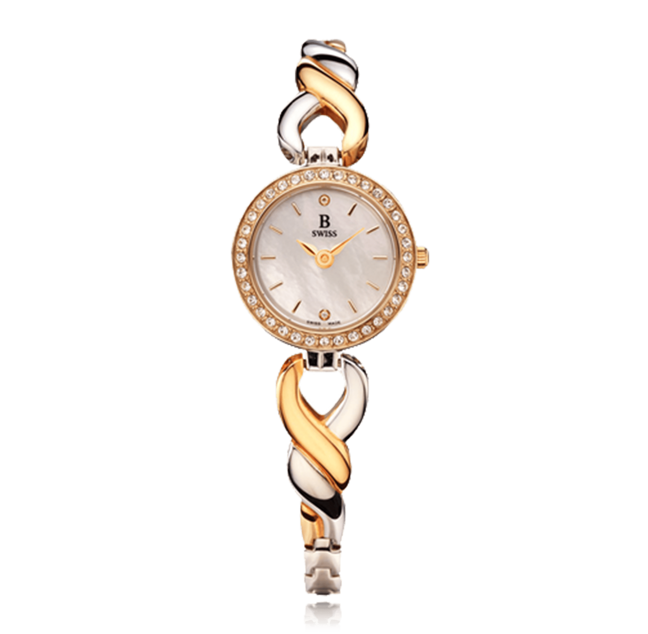 B SWISS Dress montre-bracelet pour dame, Stahl/PVD bico quartz ronde étanche cadran: nacre blanc zircone / indices, bracelet acier/PVD verre saphir 36 zircon, Case No. 00.90014.35.79.31
