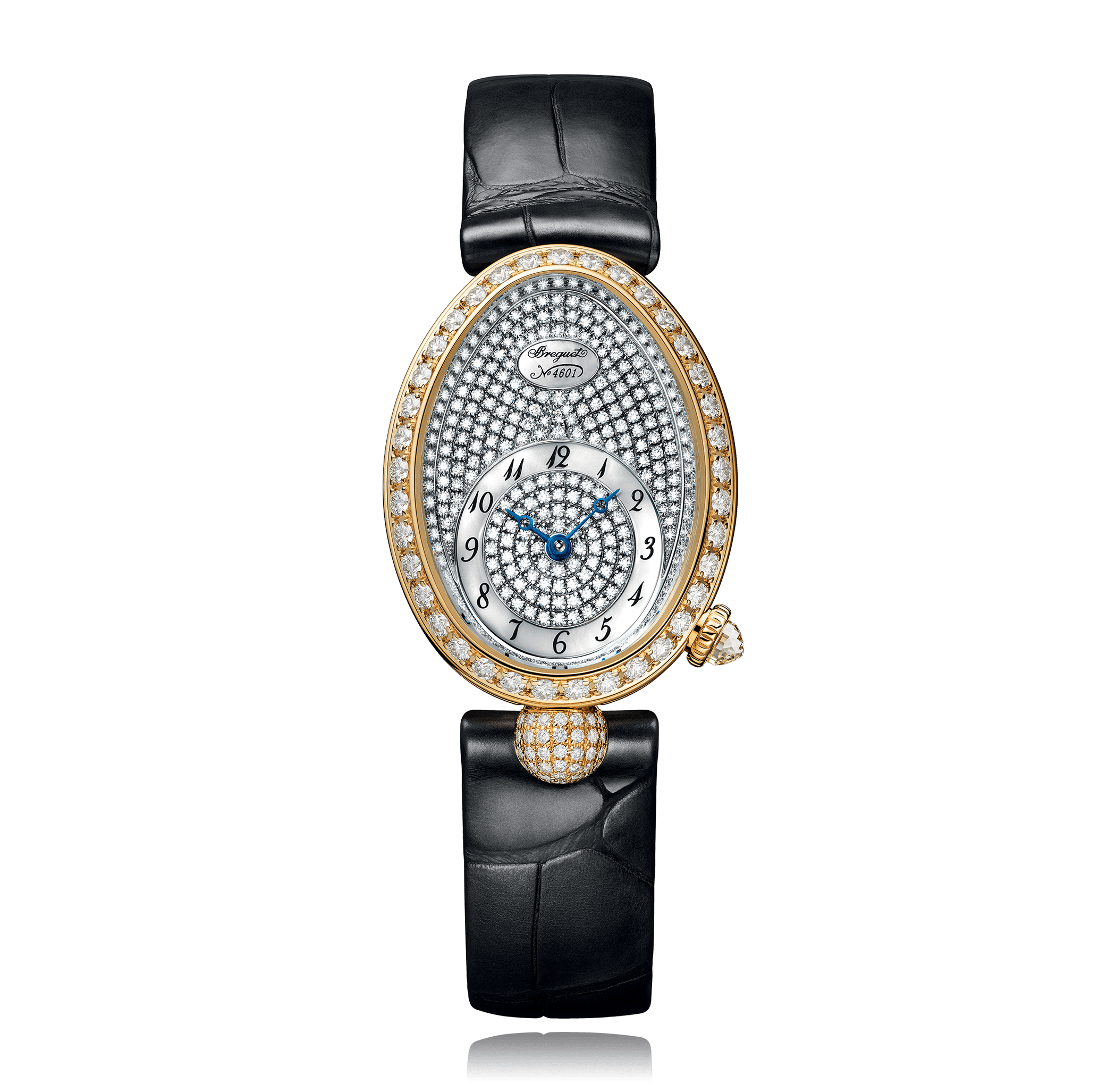 Montre-bracelet BREGUET Reine De Naples or jaune 18K, cuir alligator, avec boucle déployante, cadran: pavé diamants avec arabes, automatique 350 diamants, total: 1,32 ct. TW-G pur à la loupe (if), Ref.:8928BA/8D/944DD0D