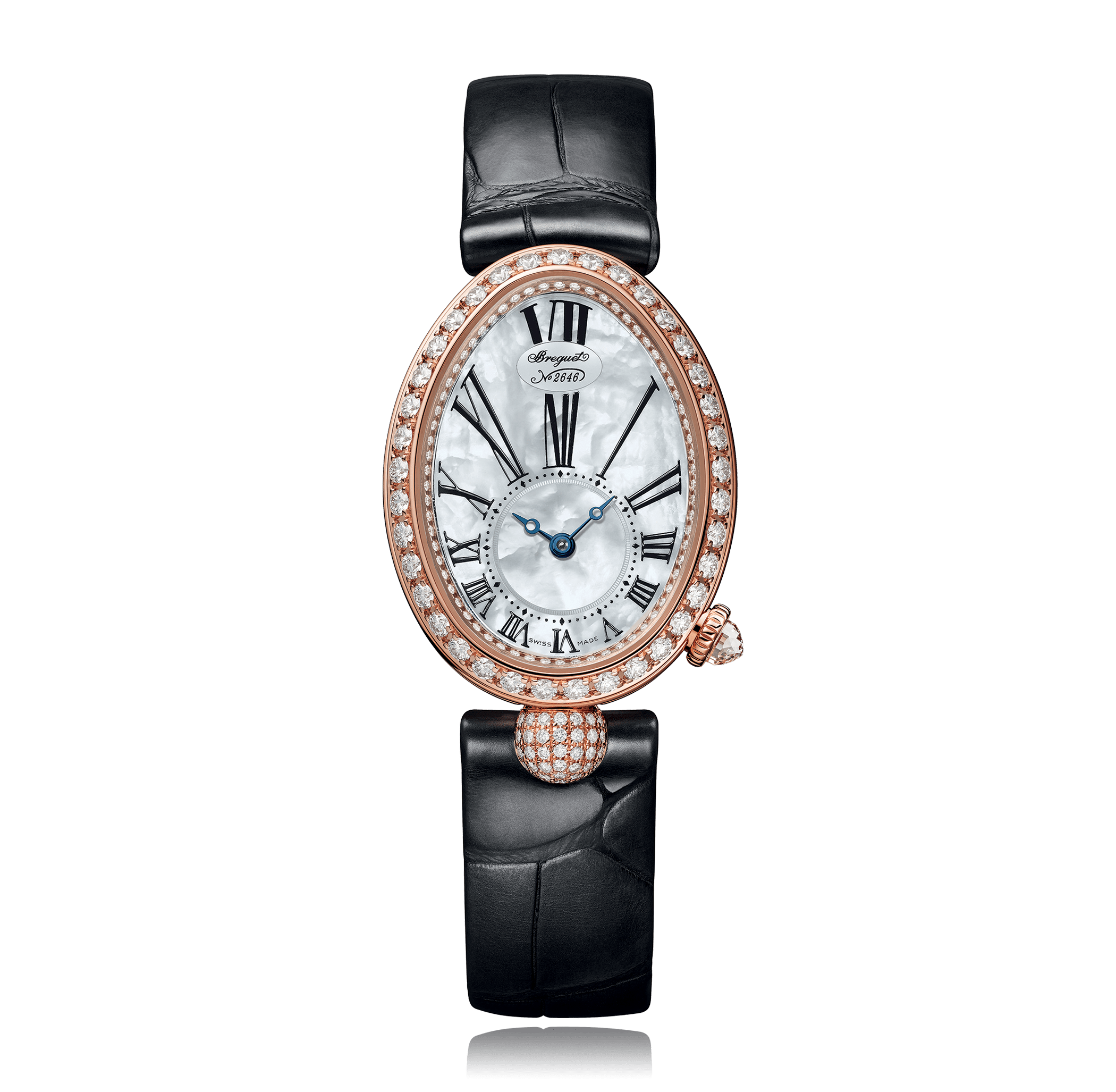 Montre-bracelet BREGUET Reine De Naples or rose 18K, cuir alligator, avec boucle déployante, cadran: pavé diamants avec romains, automatique Calibre 586, glace saphir, 3 atm, 139 diamants, total: 1,32 ct. Ref.:8928BR/8D/944DD0D