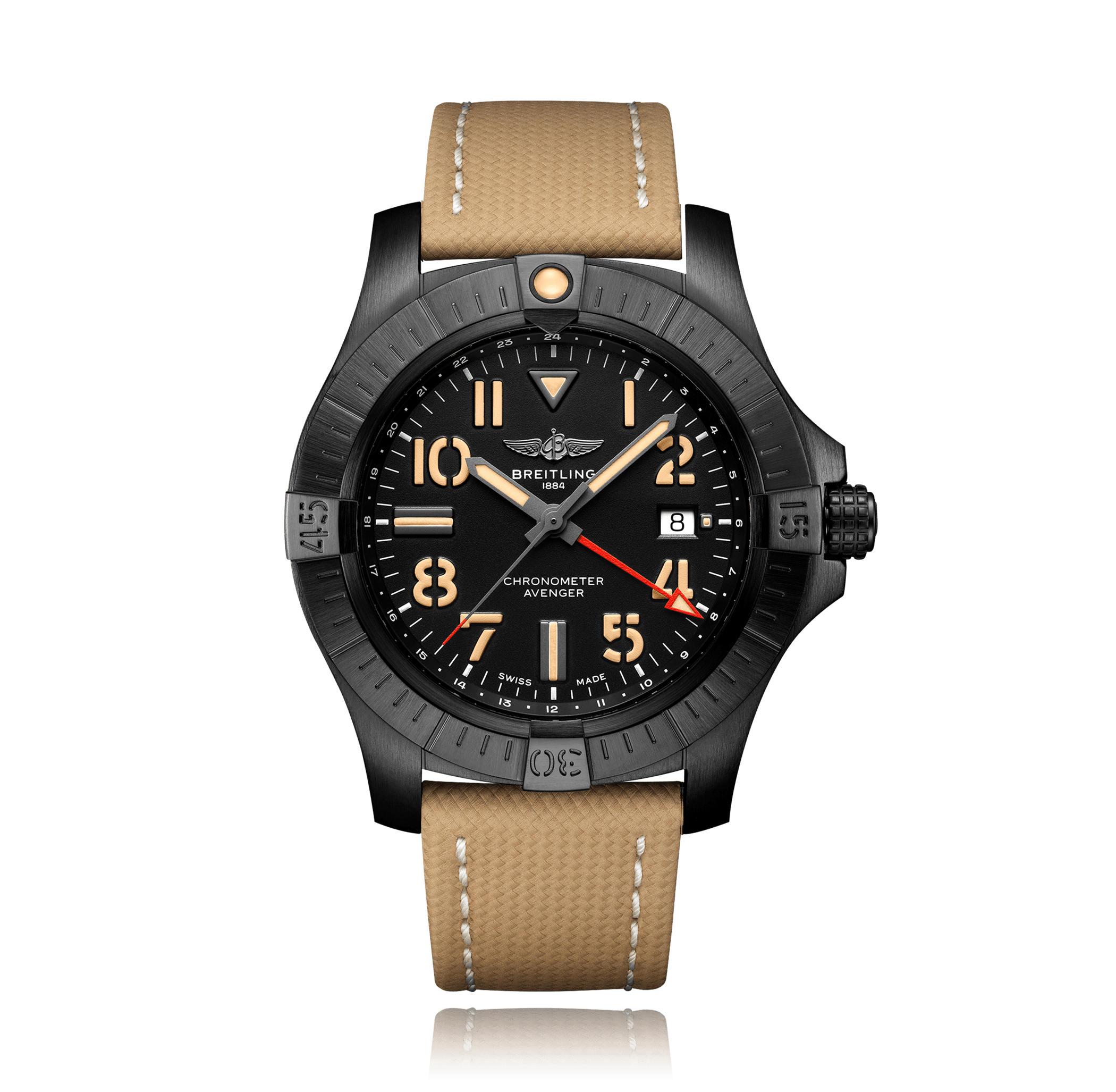 Montre-bracelet, BREITLING Avenger GMT, 45 mm, Titan avec revêtement DLC, bracelet cuir de veau, avec boucle déployante, cadran: noir avec index, automatique, Calibre Breitling 32, seconde central, glace saphir, 30 atm, Ref.:V32395101B1X2