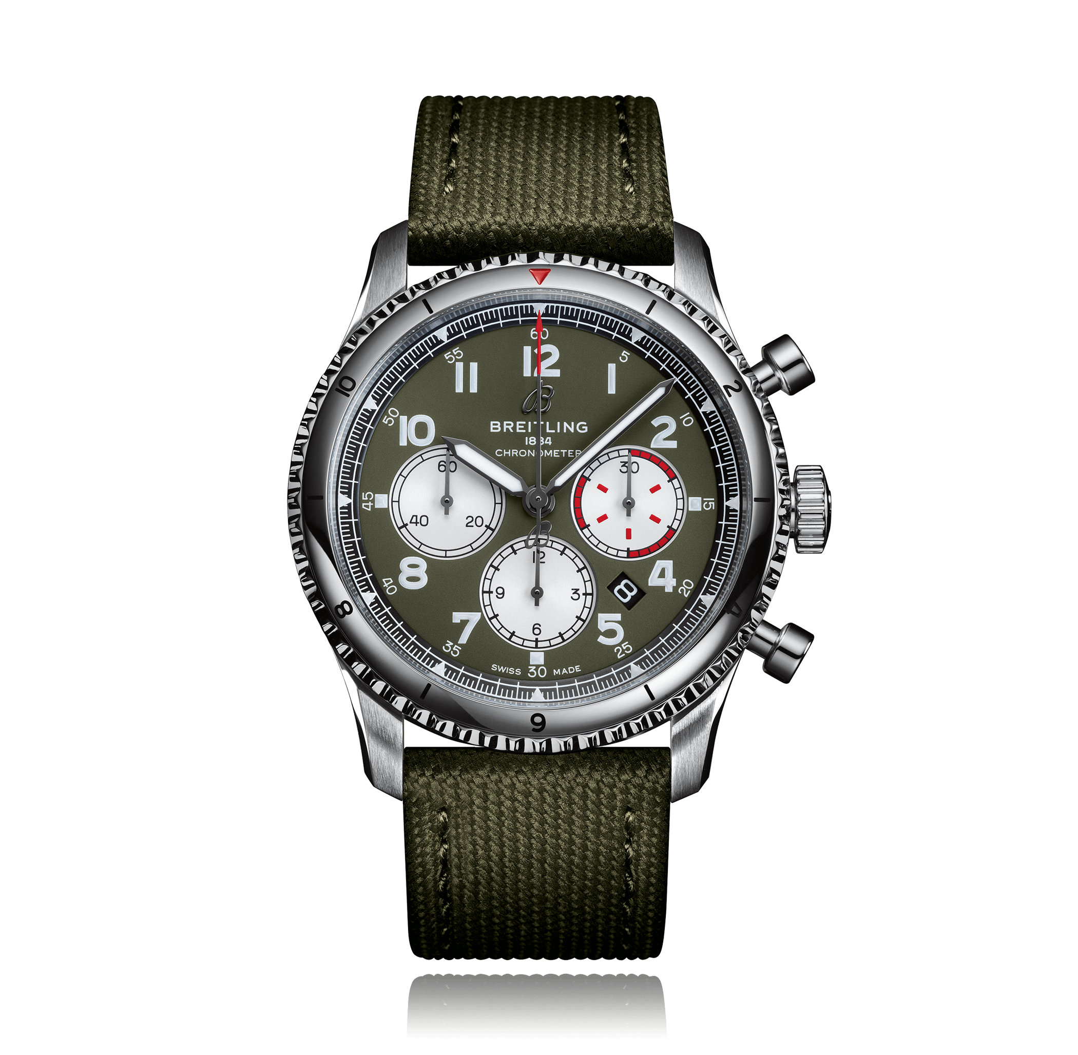 Chronographe BREITLING Aviator 8 B01 Chronograph 43, 43mm, acier Military bracelet cuir, avec boucle ardillon, cadran: kaki avec arabes, automatique Calibre Breitling B01, glace saphir, 10 atm/couronne vissée, Ref.:AB01192A1L1X1