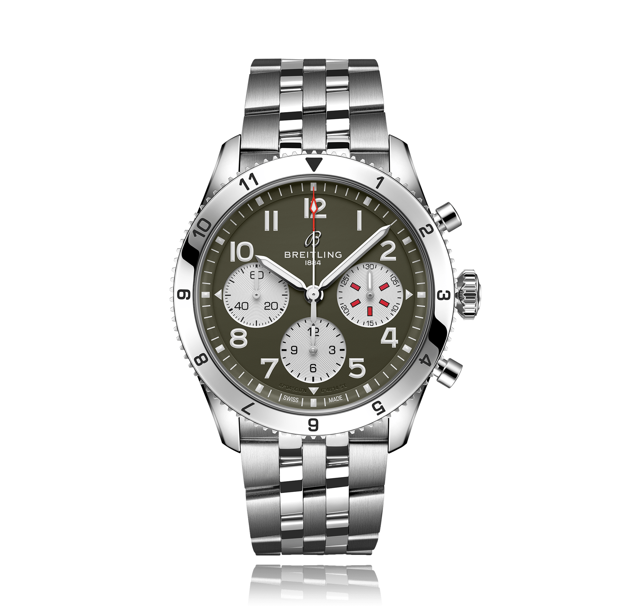Chronographe, BREITLING Aviator CLASSIC AVI CHRONOGRAPH 42, 46 mm, acier,. bracelet acier, avec boucle déployante, cadran: vert avec arabes, automatique, Calibre Breiting B04, petite seconde, glace saphir, 10 atm, Keramik Ref.:A233802A1L1A1