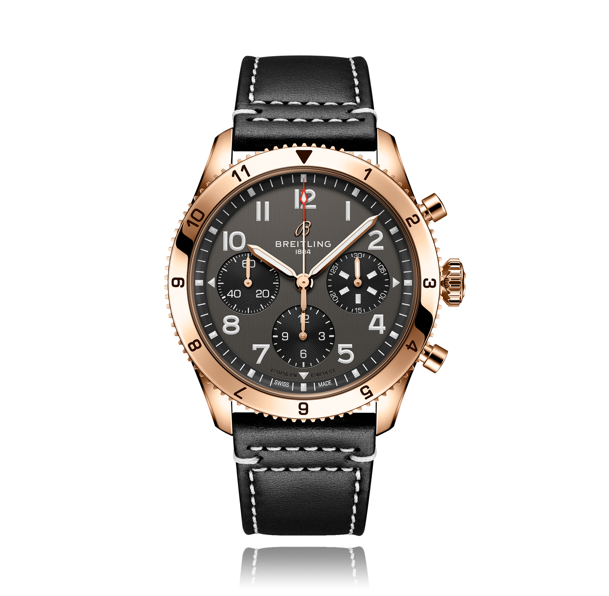 BREITLING chronographe, CLASSIC AVI CHRONOGRAPH 42 P-51 MUSTANG, 42 mm, or rose,. bracelet cuir de veau, avec boucle déployante, cadran: noir avec arabes, automatique, Calibre Breiting 23, petite seconde, glace saphir, 10 atm, Ref.:R233801A1B1X1