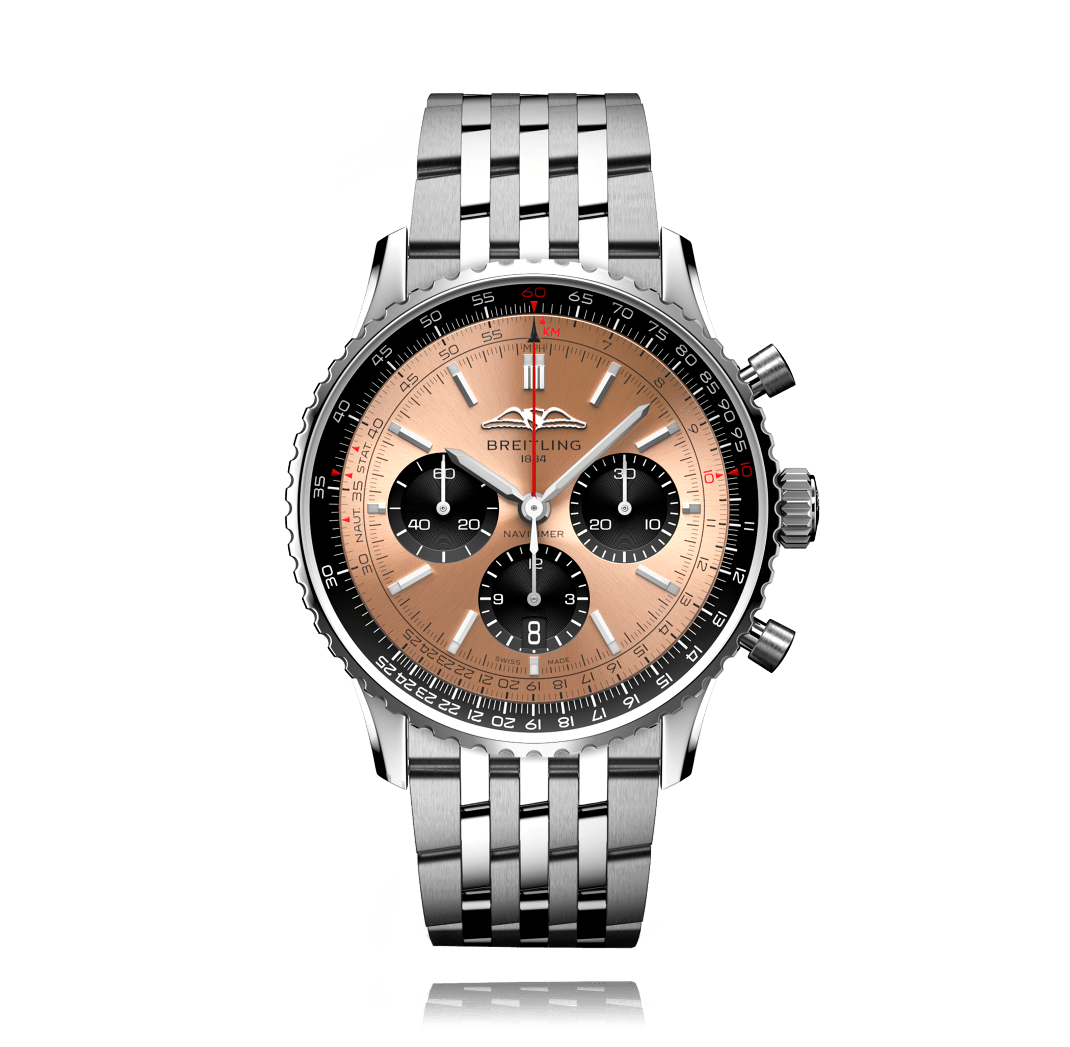 Chronographe, BREITLING Navitimer B01 Chronograph 43, 43 mm, acier, Navitimer bracelet acier, cadran: cuivre avec index, automatique, Calibre Breitling B01, glace saphir, 3 atm, Ref.:AB0138241K1A1