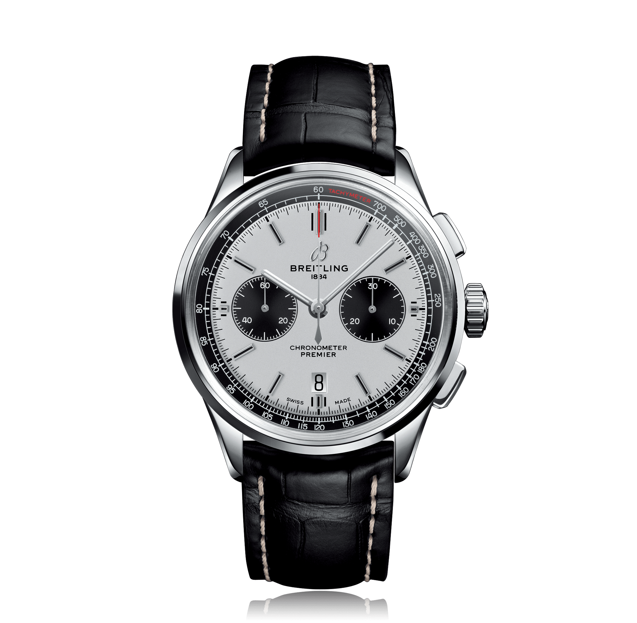 Chronographe BREITLING Premier B01 Chronograph 42, 42mm, acier cuir de crocodile, avec boucle déployante, cadran: argenté avec index, automatique Calibre Breitling B01, glace saphir, 10 atm, Ref.:AB0118221G1P1