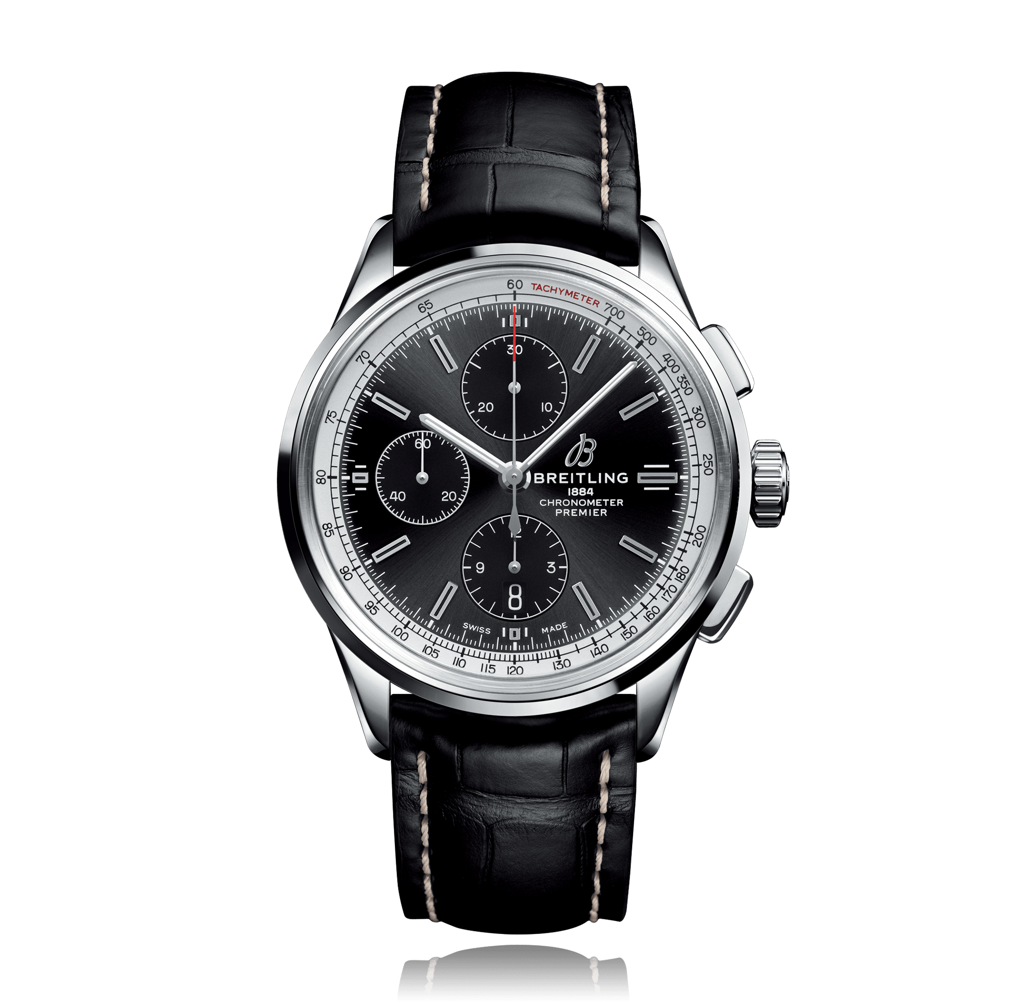 Chronographe BREITLING Premier Chronograph 42, 42mm, acier cuir de crocodile, avec boucle déployante, cadran: noir avec index, automatique Calibre Breitling 13, glace saphir, 10 atm, Ref.:A13315351B1P1