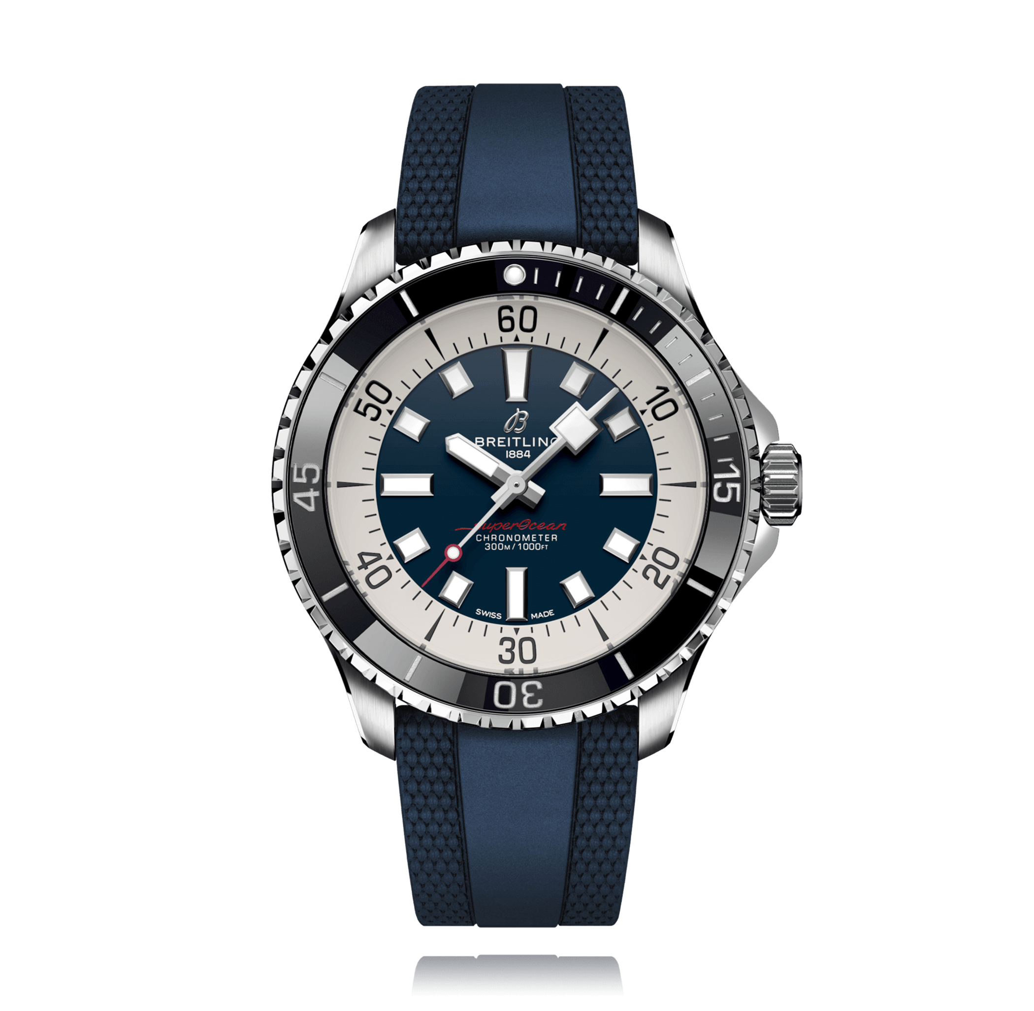 Montre-bracelet, BREITLING Superocean Automatic 44, 44 mm, acier,. bracelet caoutchouc, avec boucle déployante, cadran: bleu avec index, automatique, Calibre Breitling 17, seconde central, glace saphir, 30 atm, Keramikinlay Lünette, Ref.:A17376211C1S1