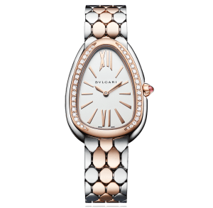 Montre-bracelet, BULGARI Serpenti Seduttori, 33 mm, acier/or rose, bracelet acier/or rose, avec boucle déployante, cadran: blanc avec romains / indices, quartz, glace saphir, 3 atm, diamants, 18 Karat Roségold, besetzt mit Diamanten Ref.:103274
