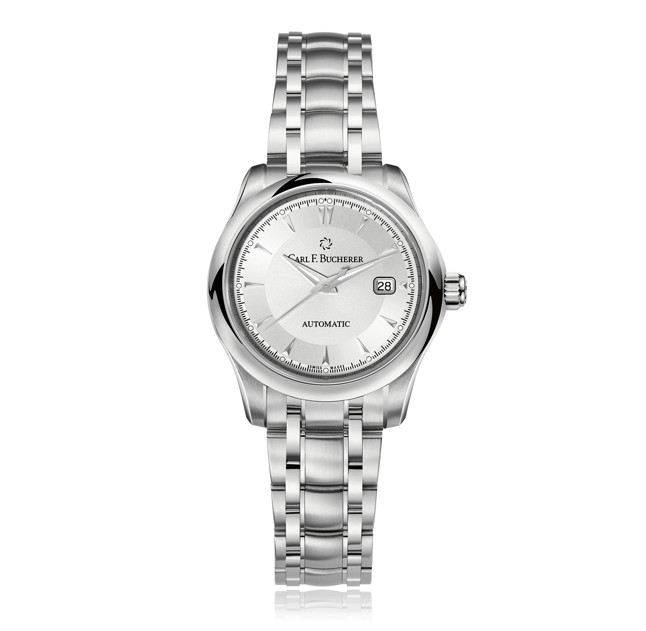 CARL F. BUCHERER Manero AutoDate 30 mm montre-bracelet acier automatique avec date ronde 3 atm cadran: argenté index, bracelet acier, Ref.:00.10911.08.13.21
