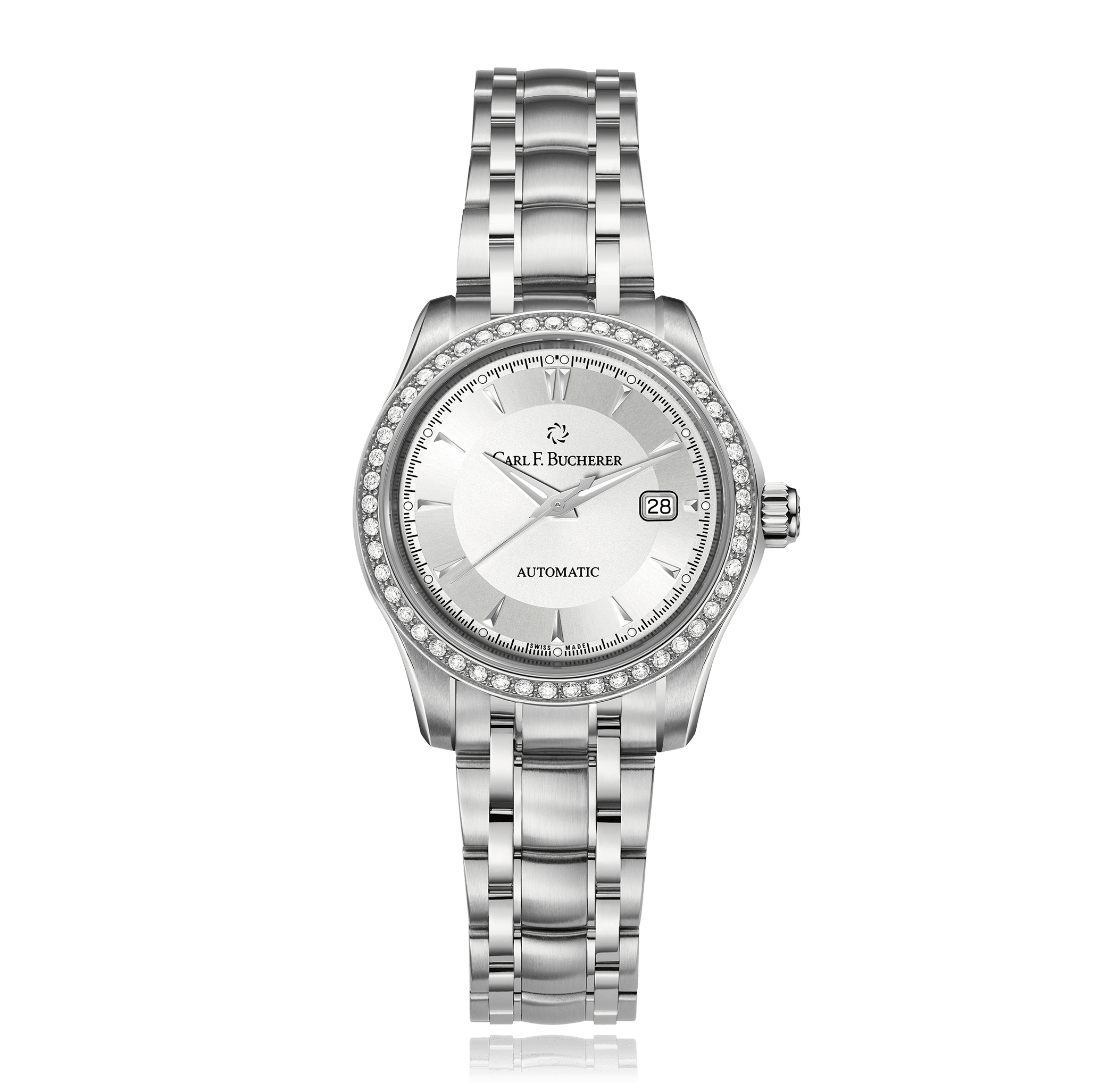 CARL F. BUCHERER Manero AutoDate 30 mm montre-bracelet acier automatique avec date ronde 3 atm cadran: argenté index, bracelet acier, 49 diamants taille brillant total 0.5 ct TW VVS Ref.:00.10911.08.13.31
