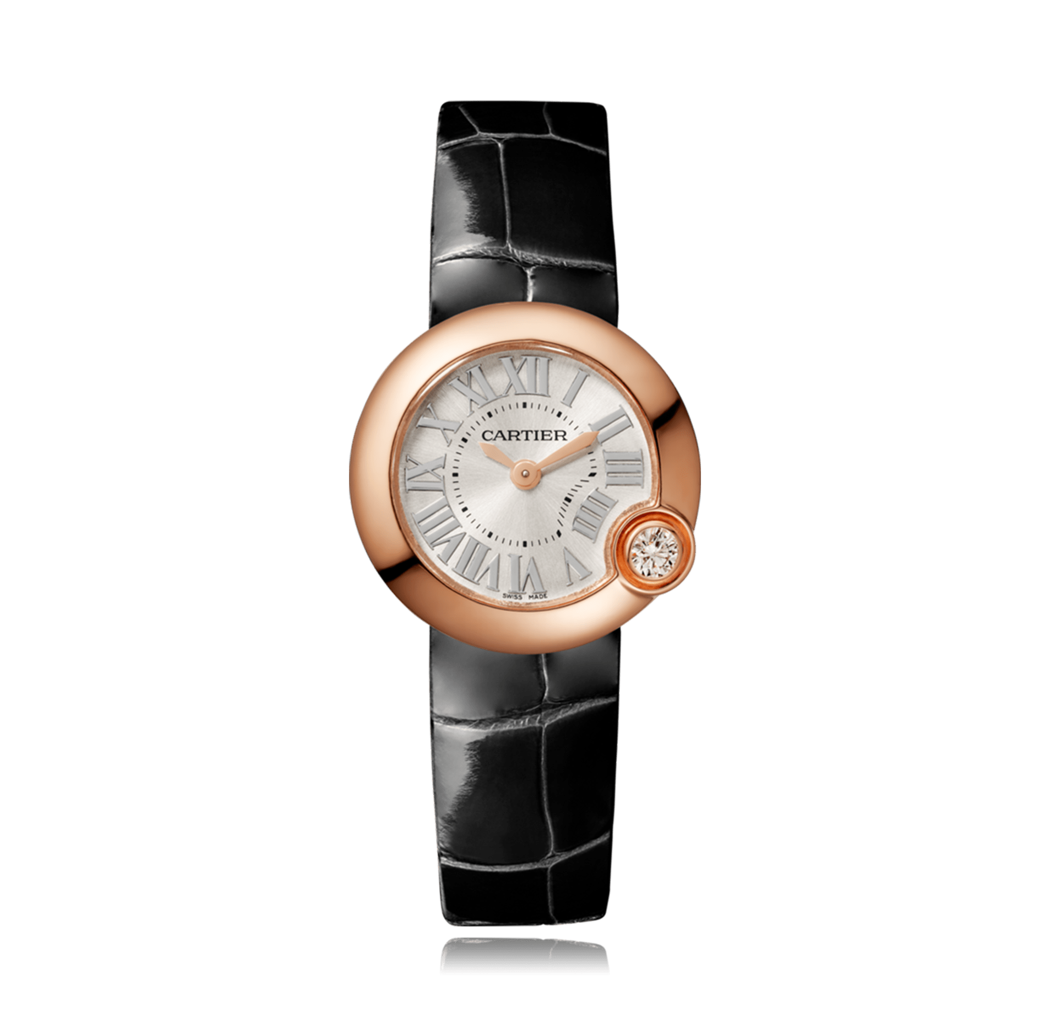 Montre-bracelet CARTIER Ballon Blanc de Cartier, 26mm, or rose 18K, cuir d'alligator, avec boucle ardillon, cadran: argenté avec chiffres romains, quartz glace saphir, 1 diamant, total: 0,16 ct. Ref.:WGBL0002