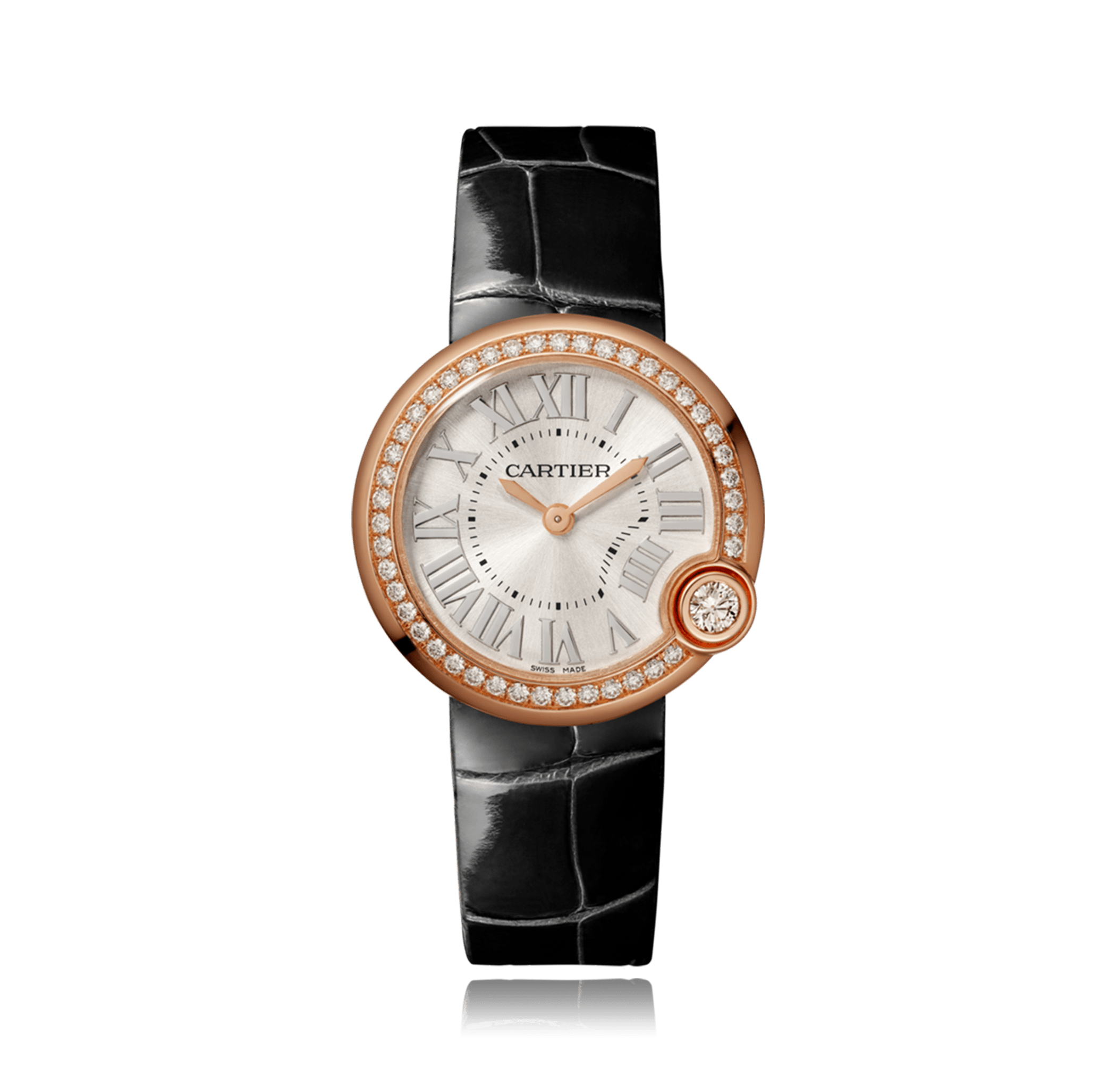 Montre-bracelet CARTIER Ballon Blanc de Cartier, 30mm, or rose 18K, cuir d'alligator, avec boucle ardillon, cadran: argenté avec chiffres romains, quartz glace saphir, 44 diamants, total: 0,73 ct. Ref.:WJBL0005