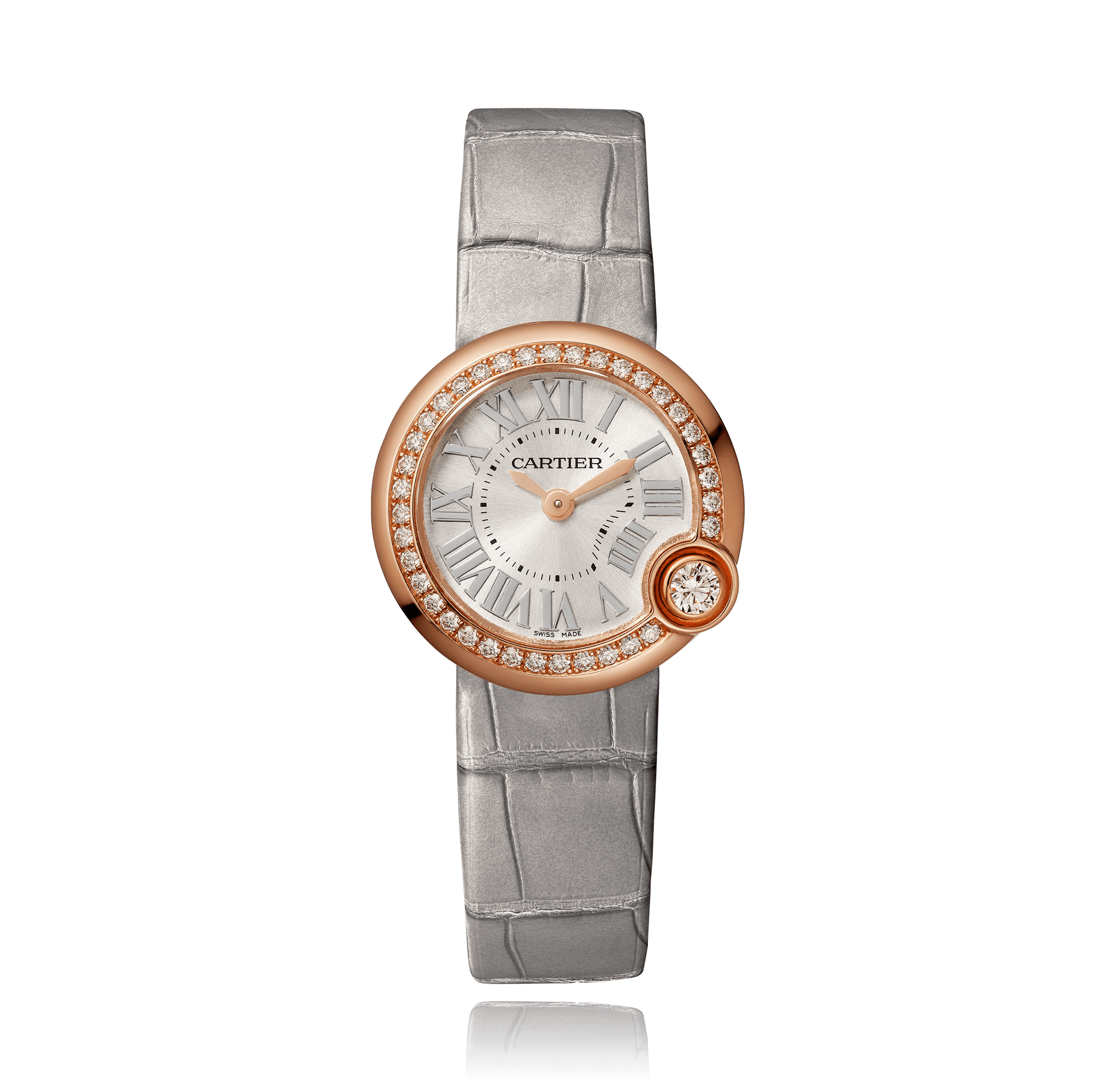 Montre-bracelet, CARTIER Ballon Blanc de Cartier, 26 mm, or rose, 18K, bracelet cuir d'alligator, avec boucle ardillon, cadran: argenté avec romains, quartz,, glace saphir, 37 diamants, total: 0.62 ct. Dia.- Lünette ef.:WJBL0006
