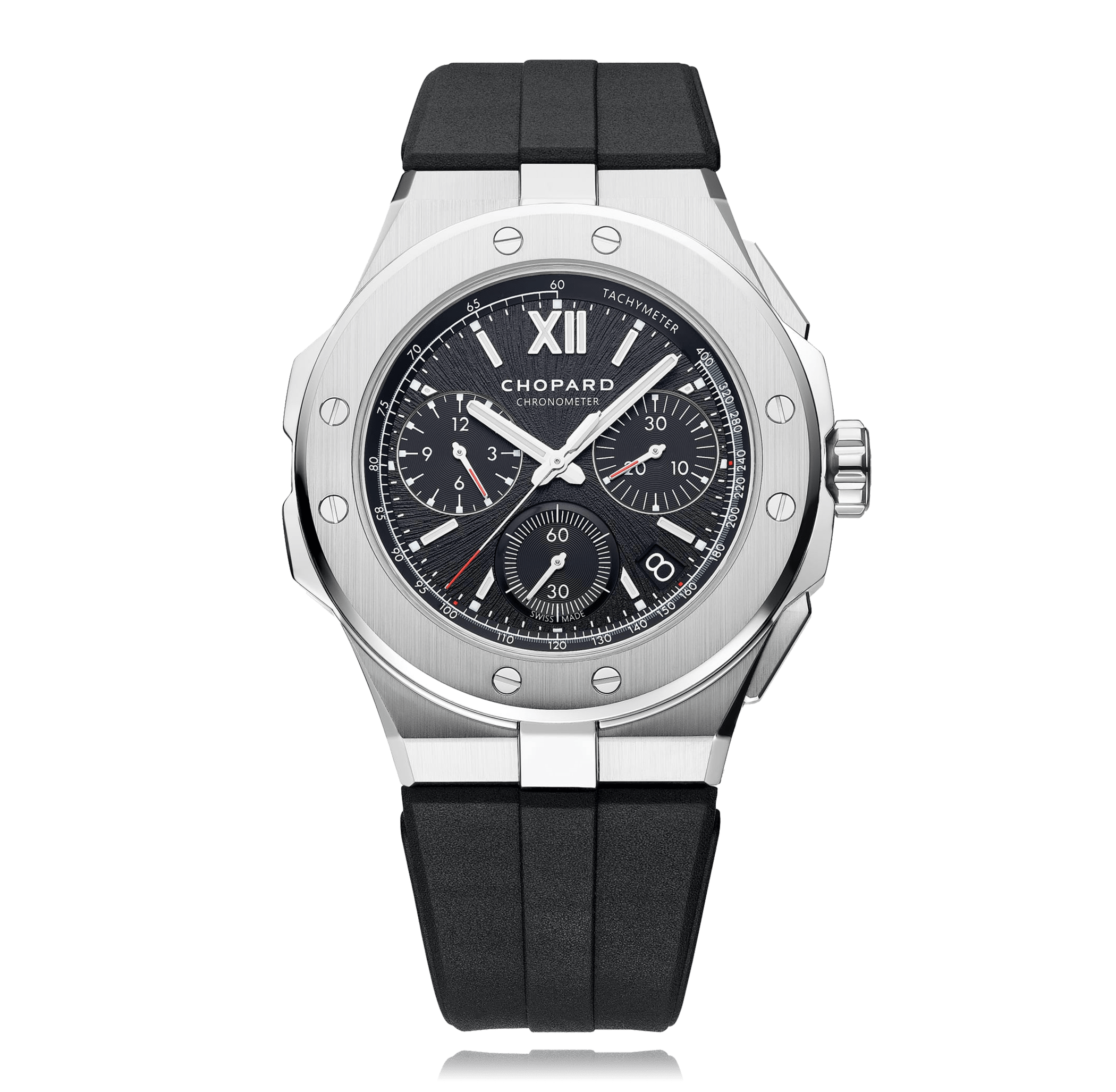 Chronographe, CHOPARD Alpine Eagle 44 mm, acier,. bracelet caoutchouc, avec boucle ardillon, cadran: noir avec romains / indices, automatique, Calibre 03.05-C, petite seconde, glace saphir, 10 atm, Ref.:298609-3004