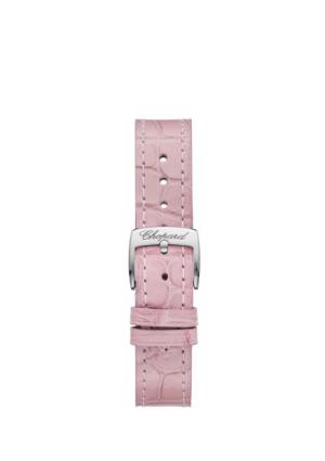 Montre-bracelet, CHOPARD Happy Sport 30 mm, Mini, acier/or rose,. bracelet cuir d'alligator, avec boucle ardillon, cadran: nacre rose avec romains / indices, automatique, Calibre 09.01-C, glace saphir, 3 atm, 5 diamants, total: 0.14 ct. Ref.:278573-6011