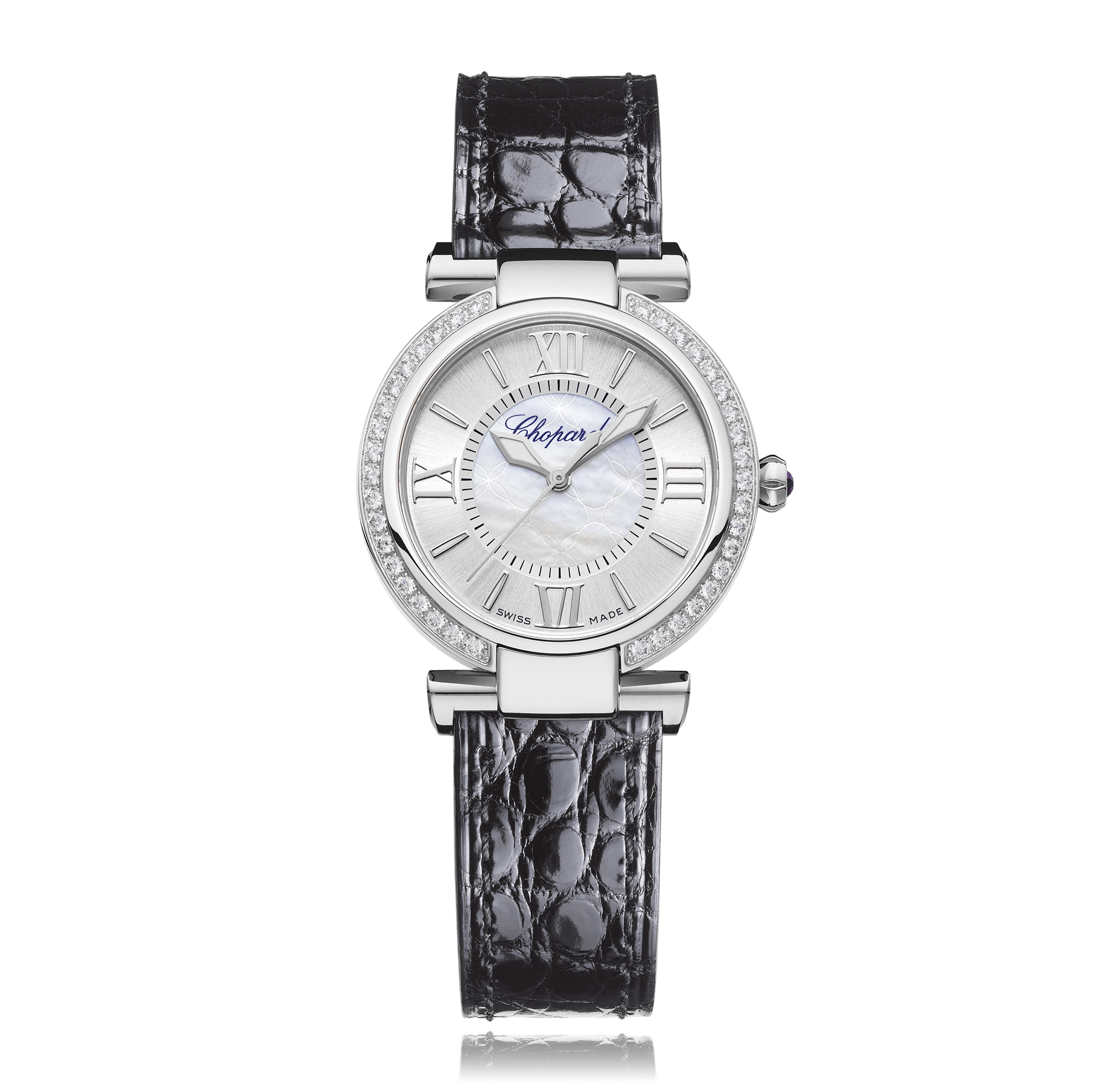 Montre-bracelet CHOPARD Imperiale 29mm, acier cuir d'alligator, avec boucle ardillon, cadran: nacre avec romains / indices, automatique glace saphir, 50 atm, 38 diamants, total: 0.46 ct. Ref.:388563-3007