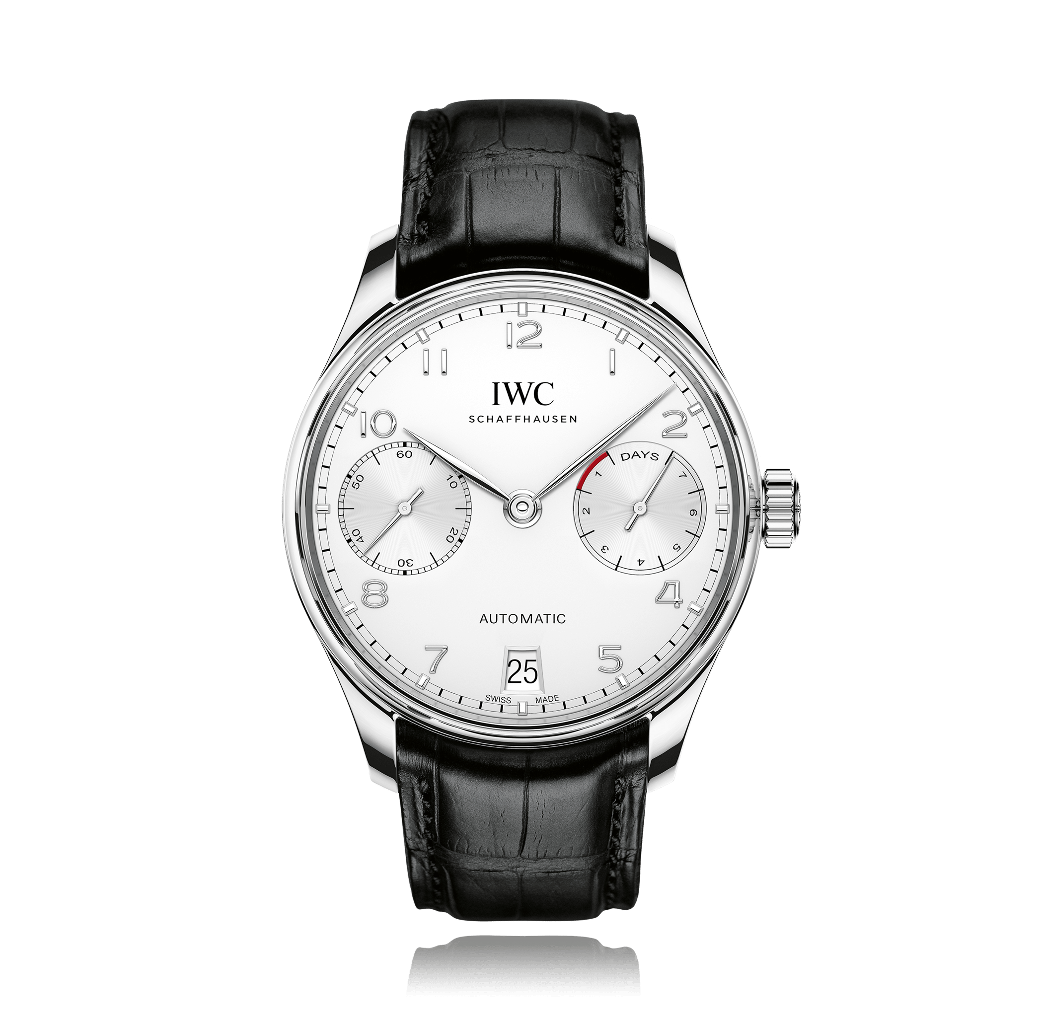 Montre-bracelet, INTERNATIONAL WATCH & CO Portugieser 42.3 mm, acier, bracelet cuir d'alligator, cadran: blanc avec arabes, automatique, Calibre 52010, petite seconde,, glace saphir, 3 atm, avec réserve de marche, ef.:IW500712