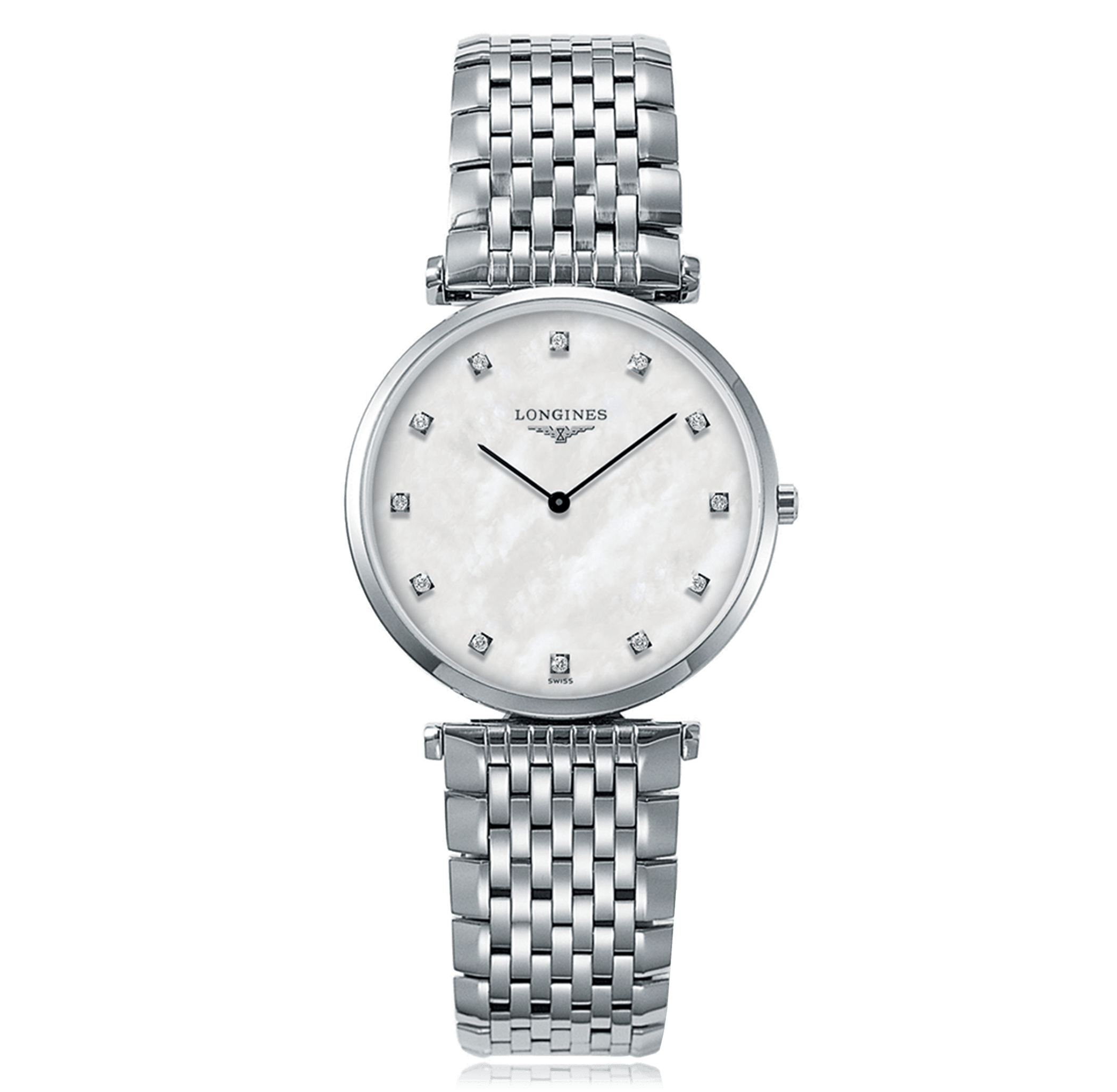 Montre-bracelet LONGINES La Grande Classique 33mm, acier bracelet acier, cadran: nacre avec 12 diamants, quartz Calibre 420, glace saphir, 3 atm, 12 diamants, total: 0.08 ct. Ref.:L4.709.4.88.6