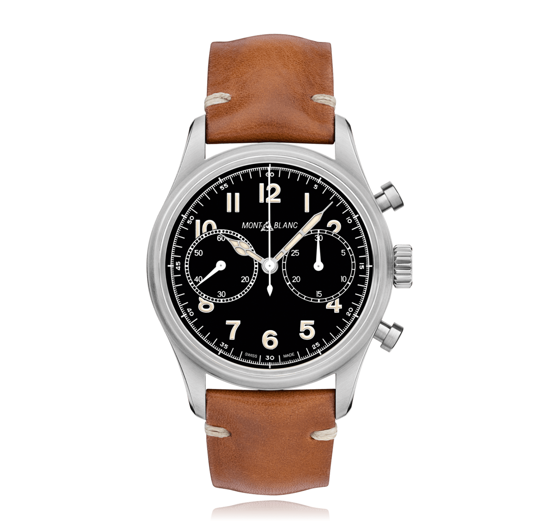 Chronographe MONTBLANC 1858 42mm, acier bracelet cuir, avec boucle déployante, cadran: noir avec romains / indices, automatique Calibre MB M25.11, glace saphir, 10 atm, Ref.:117836