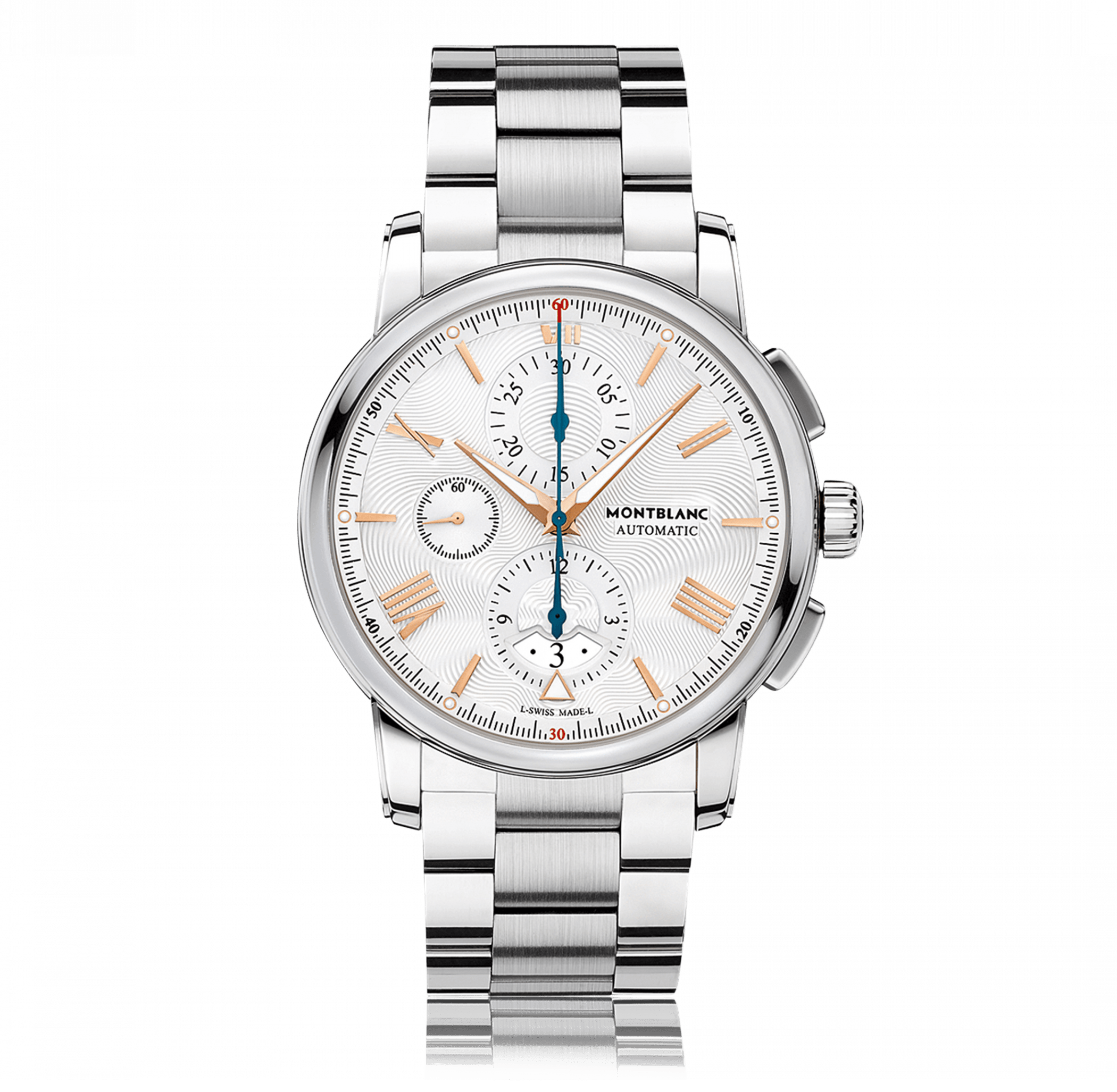 Chronographe MONTBLANC 4810 43mm, acier bracelet acier, avec boucle déployante, cadran: argenté avec romains / indices, automatique Calibre MB M25.07, glace verre saphir avec revétement anti reflet sur deux côtés, 5 atm, Ref.:114856