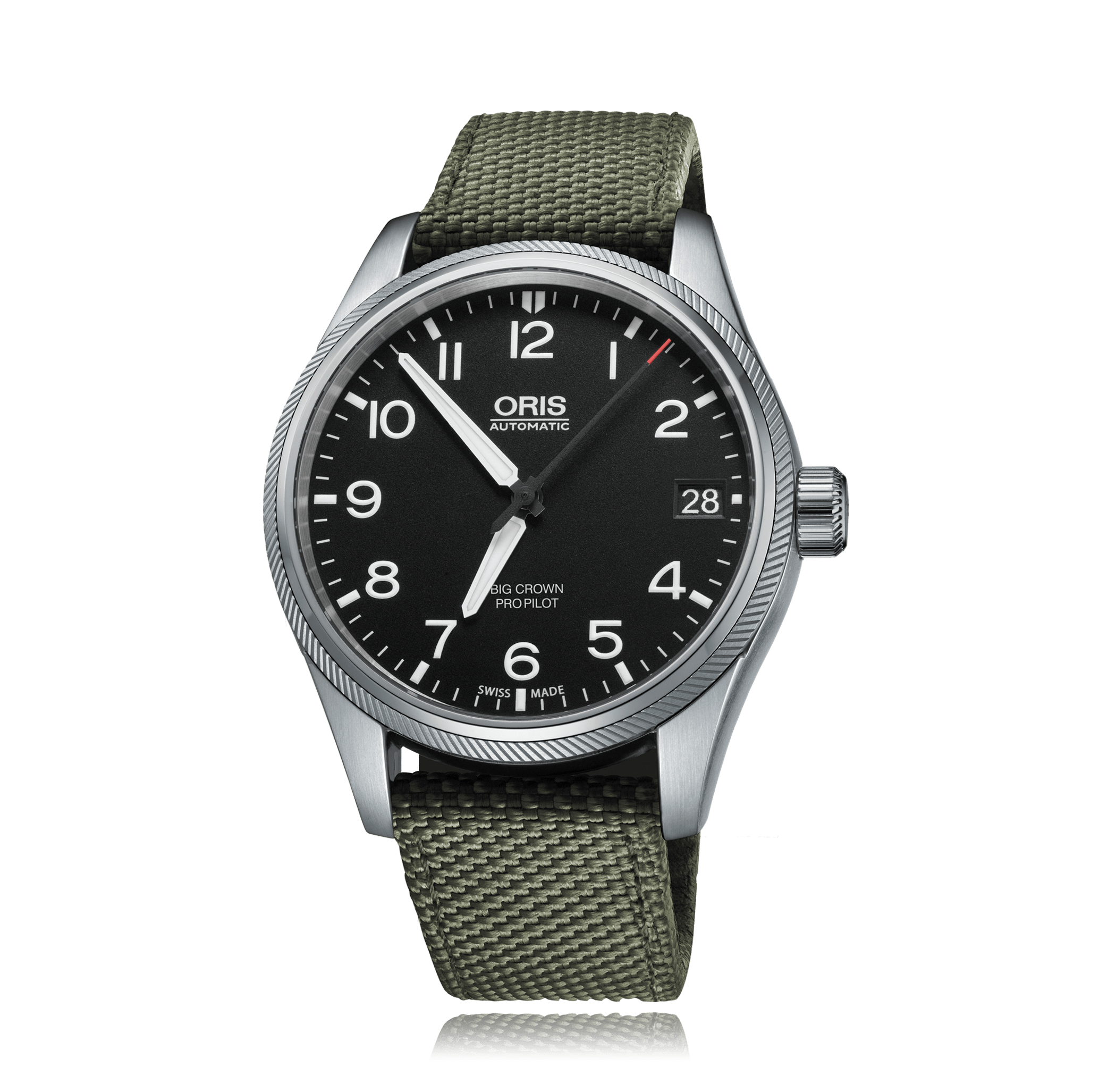 Montre-bracelet ORIS BC ProPilot ProPilot Date, 41mm, acier bracelet en textile, avec boucle déployante, cadran: noir avec arabes, automatique Calibre SW 220-1, glace saphir, 10 atm/couronne vissée, Ref.:751.7697.4164-5.20.14FC