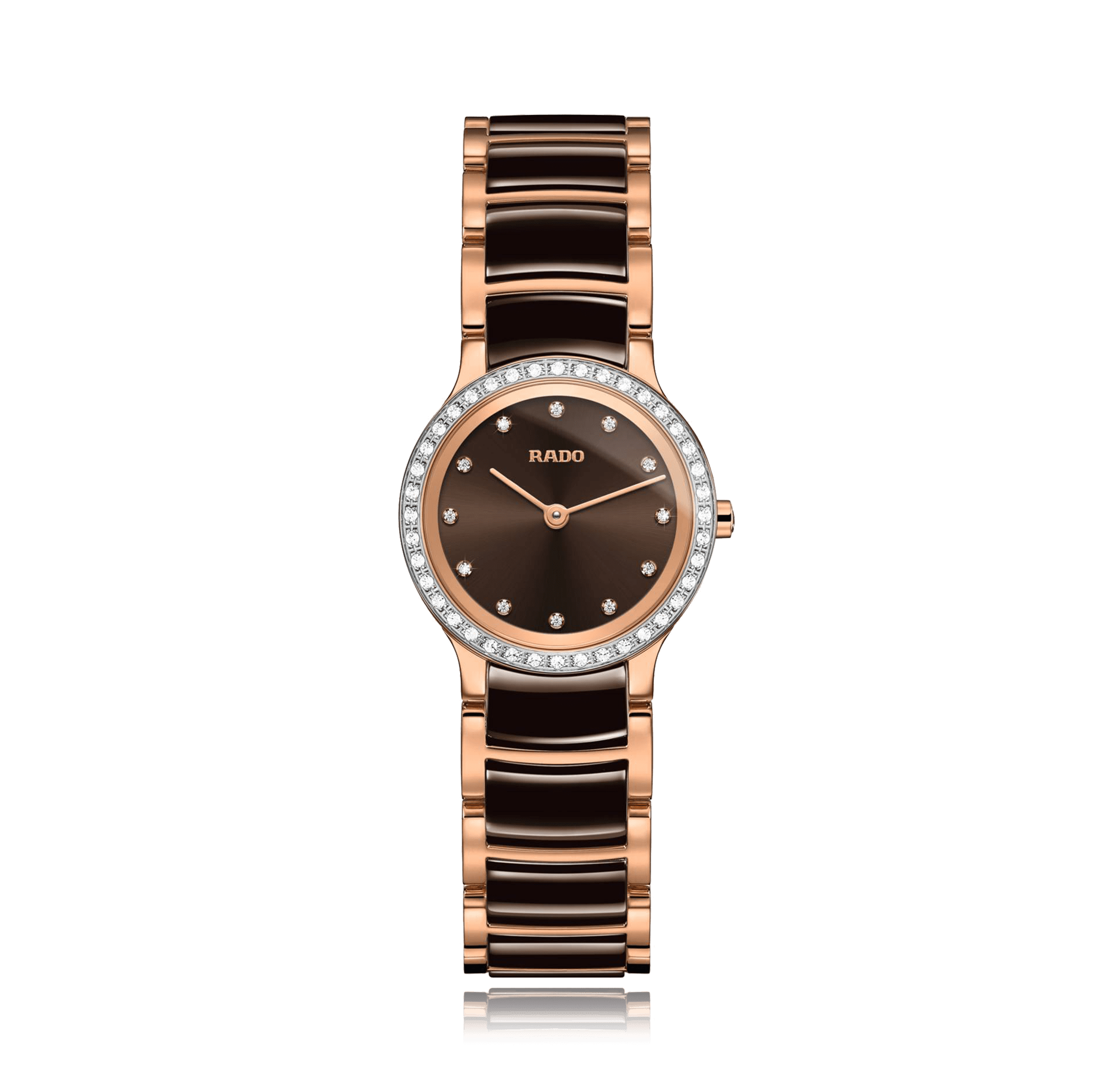 Montre-bracelet RADO Centrix 23 mm, small, acier/PVD rose bracelet acier/céramique, cadran: brun avec 12 diamants, quartz glace saphir, 3 atm, Ref.:R30218702