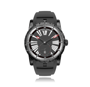Functions: Boîtier en carbone high tech pour un confort exceptionnel et un look unique. Cadran noir mat avec chiffres romains en transferts blancs, petite seconde à 6 heures et date à 6 heures. Réhaut intérieur noir, chiffres arabes en transferts blancs et minuterie rouge. Réhaut extérieur argenté, appliqués blancs avec filet noir en transferts. Etanchéité 3 BAR (30 m), bracelet en caoutchouc noir (adapté aux environnements humides), boucle déployante ajustable en acier inoxydable 316L et titane DLC noir, mouvement à remontage automatique RD830. Production non limitée. Features: La version subversive chic et lifestyle de notre emblématique collection Excalibur. Mouvement automatique exclusif Roger Dubuis RD830 avec date. Comme les fibres de carbone sont dispersées au hasard dans le matériau brut, chaque boîtier en carbone possède un motif unique. Masse oscillante en précieux or rose 22 carats. Le carbone est 10 fois plus léger que l’or. C’est pourquoi la montre est remarquablement confortable au poignet. Les bracelets en carbone sont adaptés à une utilisation au quotidien grâce à une excellente résistance aux rayures.