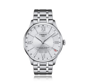 Montre-bracelet TISSOT T-Classic Chemin des Tourelles, 42mm, acier bracelet acier, avec boucle déployante, cadran: argenté avec romains / indices, automatique Calibre Powermatic 80.661, glace verre saphir avec revêtement anti reflet d`un côté, 5 atm, avec GMT, Ref.:T099.429.11.038.00