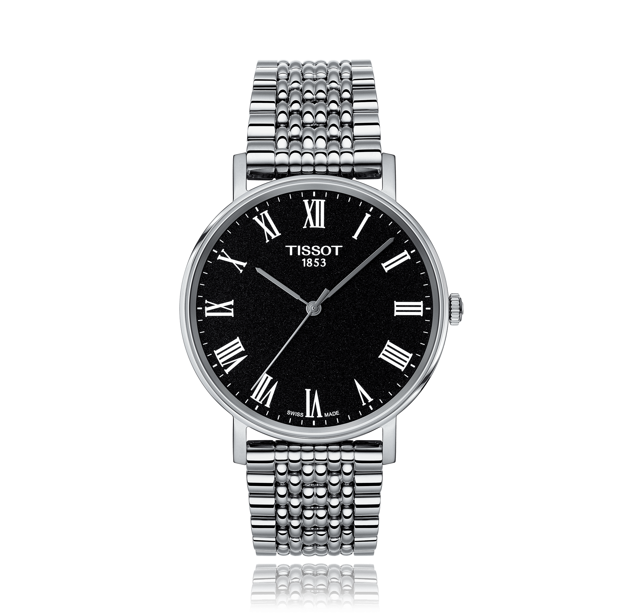 Montre-bracelet TISSOT T-Classic Every Time, 38mm, acier bracelet acier, cadran: noir avec romains, quartz Calibre ETA 902.101, glace saphir, 3 atm, Ref.:T109.410.11.053.00