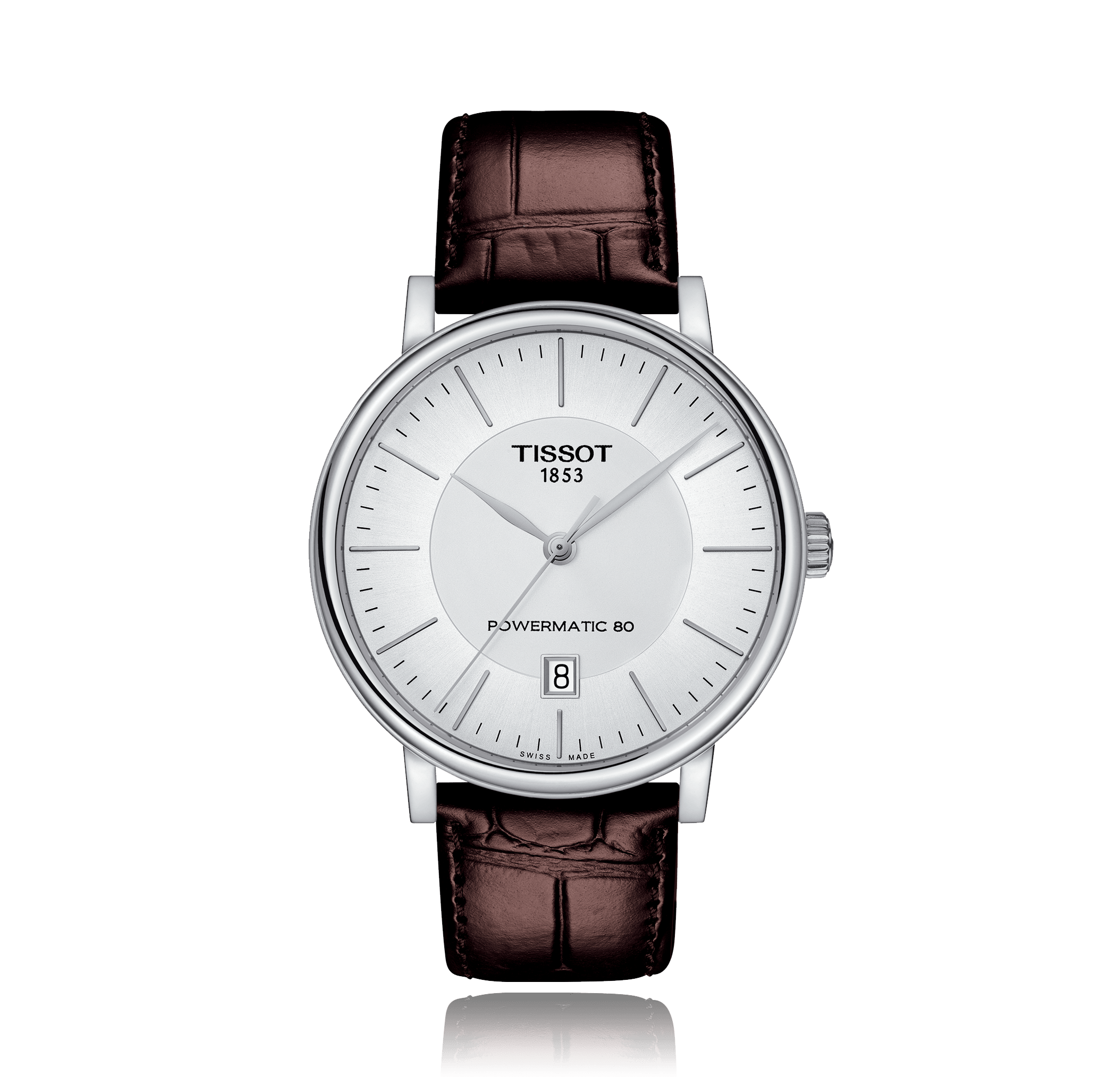Montre-bracelet TISSOT T-Classic Carson, 40mm, acier bracelet cuir, avec boucle ardillon, cadran: argenté avec index, automatique Calibre POWERMATIC 80.111, glace saphir, 5 atm, Ref.:T122.407.16.031.00