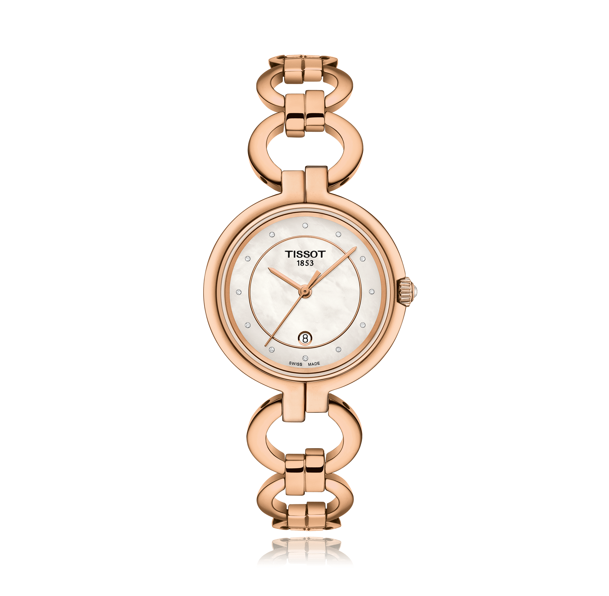 Montre-bracelet TISSOT T-Lady Flamingo, 26mm, acier/PVD rose bracelet acier, cadran: nacre blanc avec 12 diamants, quartz Calibre F03.111, glace saphir, 5 atm, avec eol, Ref.:T094.210.33.116.01