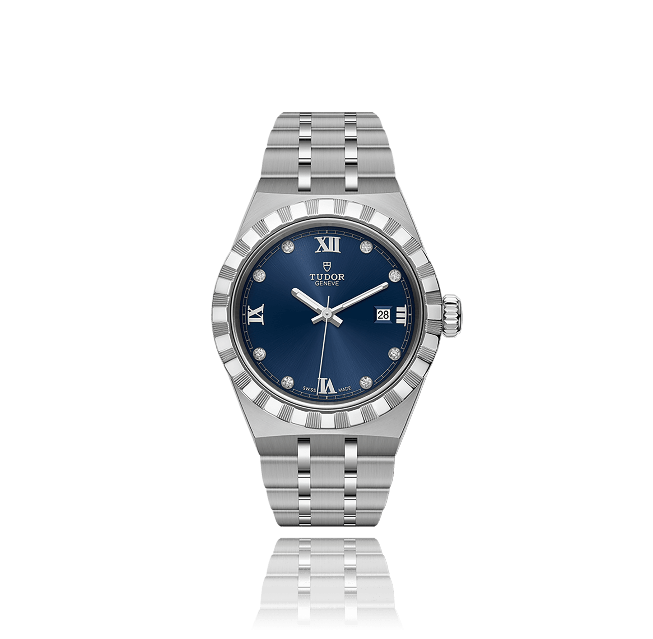 Montre-bracelet, TUDOR Royal Date 28, 28 mm, acier,. bracelet acier, cadran: bleu avec romains / diamants, automatique, Calibre T201, glace saphir, 10 atm, Ref.:28300-91030