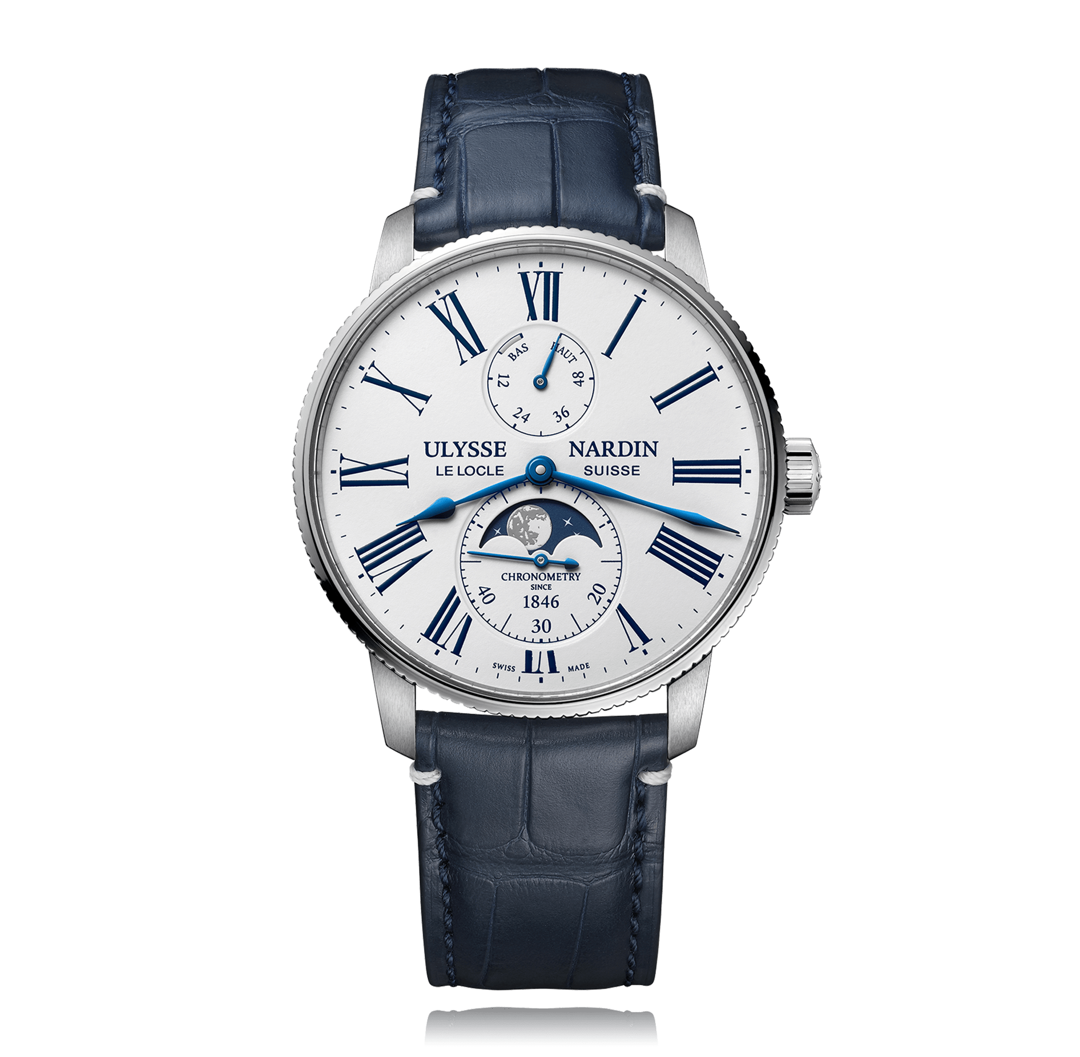 ULYSSE NARDIN montre-bracelet, Marine 42 mm, acier,. bracelet cuir d'alligator, avec boucle déployante, cadran: blanc automatique, Calibre CAL-119, glace saphir, 5 atm, avec avec phases de lune, Torpilleur Ref.:1193-310LE-0A-175/1A