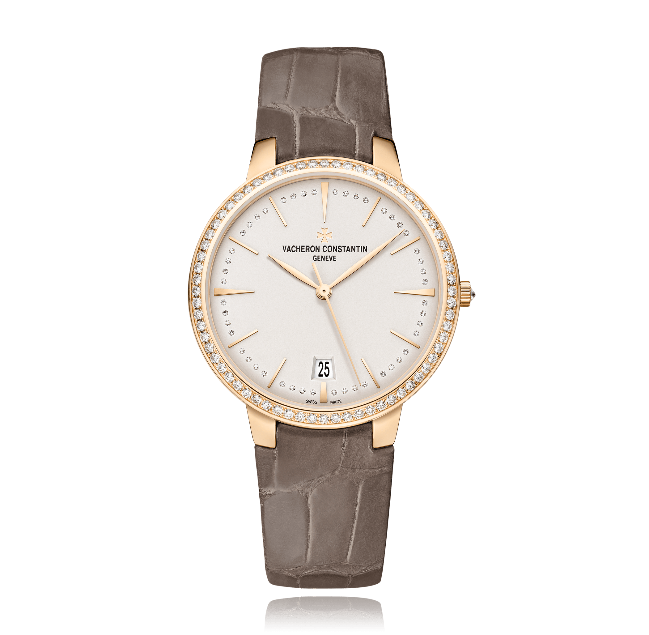 Montre-bracelet, VACHERON & CONSTANTIN Patrimony 36.5 mm, or rose, 18K,. bracelet cuir d'alligator, avec boucle ardillon, cadran: argenté avec indices / diamants, automatique, Calibre 2450 Q6, seconde central, glace saphir, 3 atm, 117 diamants, total: 1.01 ct. Dia.- Lünette Ref.:X85R8877