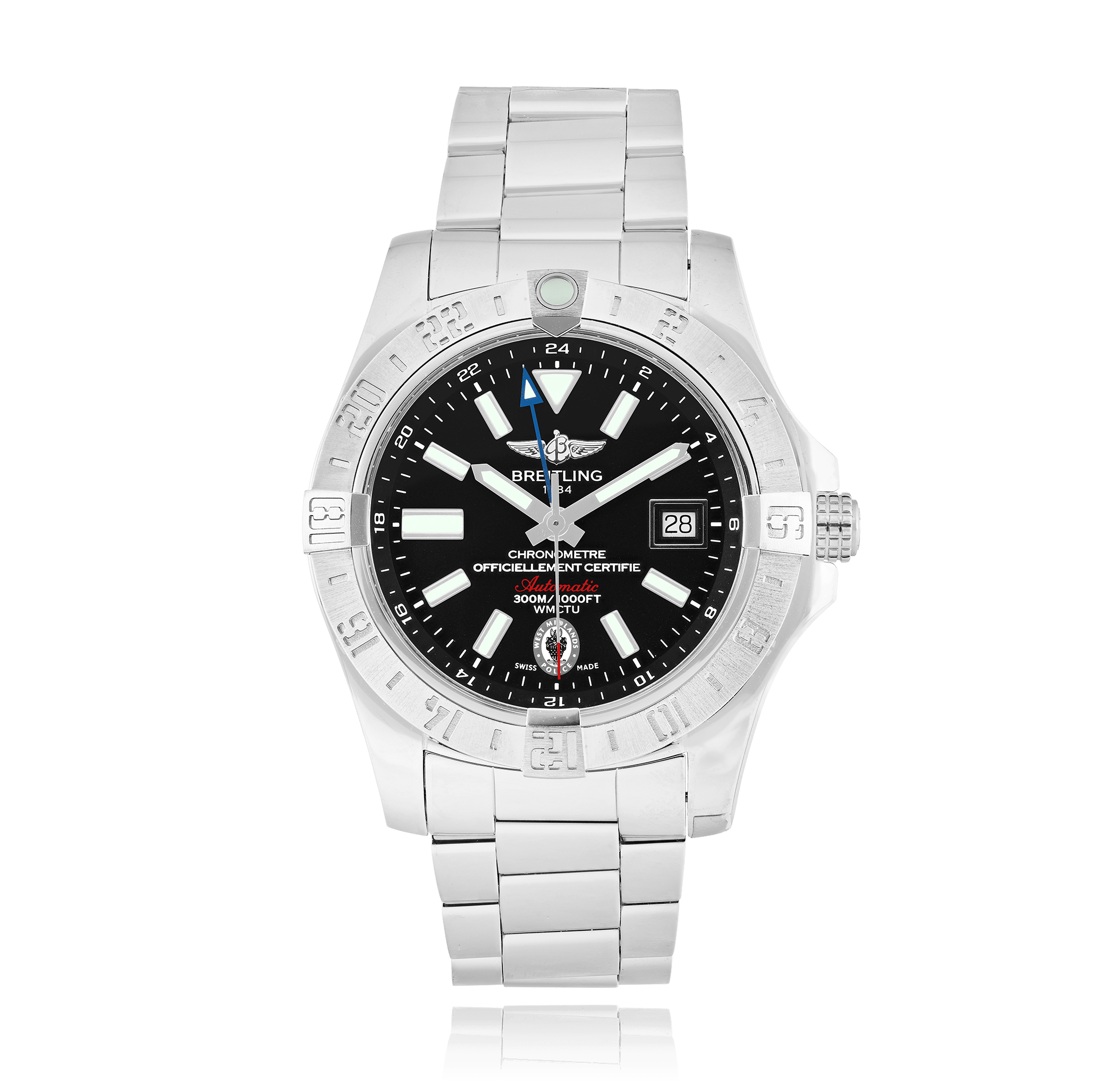 Breitling Avenger mit einem 44 mm Edelstahl Gehäuse und Saphir-Glas, Wasserdicht; im Innern befindet sich das Automat Kaliber B32, mit Zusatzfunktion GMT das Zifferblatt ist Schwarz Index mit Datums-Anzeige, das Band ist ein Stahl Metallband; Zubehör: Verkaufs-Box (original), Verkaufs-Garantie (original).